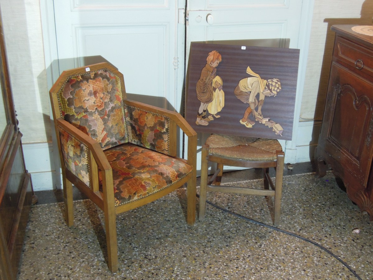 Paire de FAUTEUILS en bois vers 1940, CHAISE paillée et PANNEAU de bois marqueté représentant des jeux d'enfants (ancien n°22).