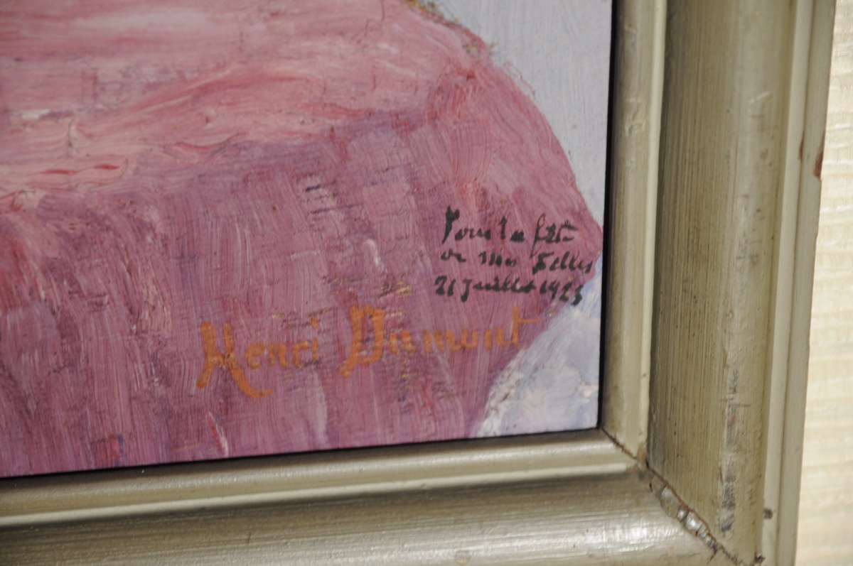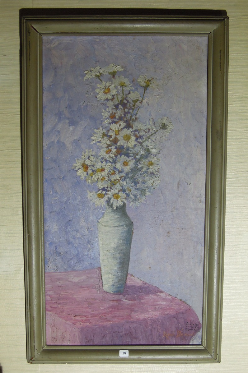 Henri DUMONT (1859-1921). Bouquet de marguerites. Huile sur toile signée en bas à droite dédicacée " pour la fête? " et datée 21 juillet 1923. 37 x 72 cm (ancien n°13).