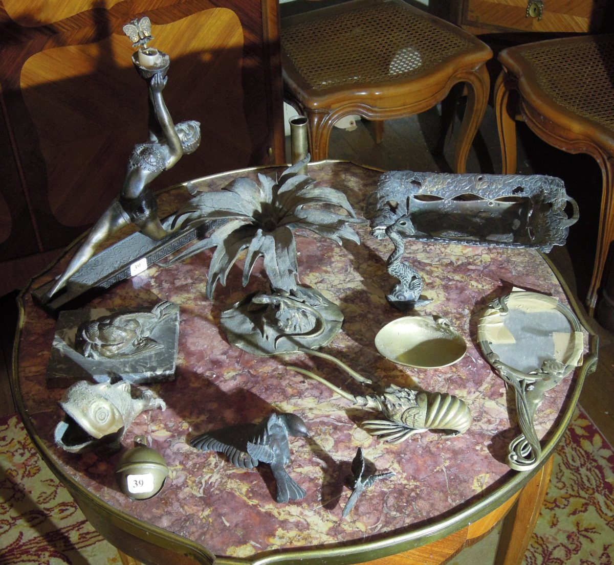 Ensemble de SCULPTURES, certaines en BRONZES autour de 1900, dont: animaliers japonais, bronzes de Vienne, langouste, oiseaux, arbre au lézard, danseuse orientale, miroir art nouveau, poisson, grelot.