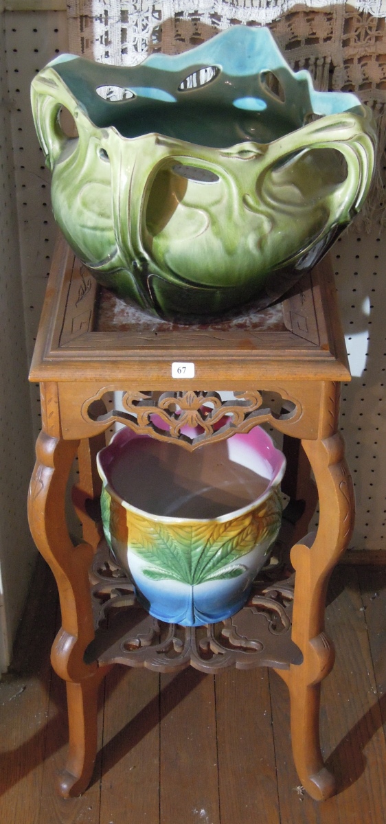 GUÉRIDON en bois naturel mouluré, à ceinture ajourée, dessus marbre (ancien n°55) et deux POTICHES en céramique dans le goût de BIGOT.