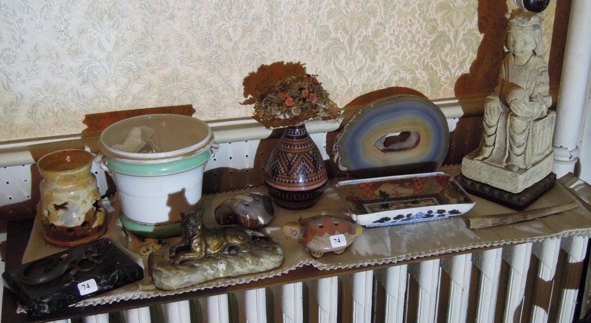 Lot de BIBELOTS sur le guéridon et sur le radiateur,...