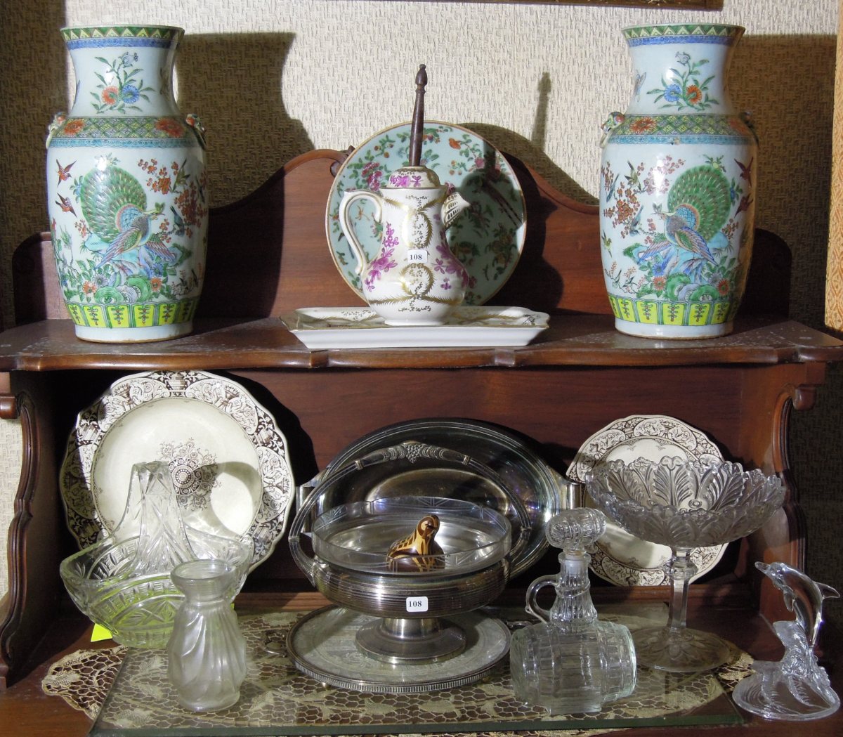 Joint: Verrerie Chocolatière à la façon de Saxe, Assiettes à décors imprimés sur les deux niveaux du dressoir.