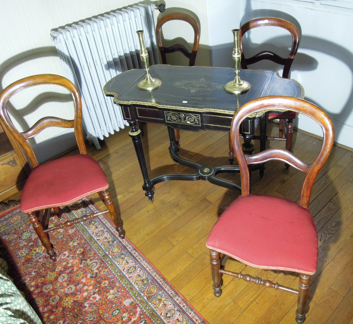 TABLE en bois noirci Napoléon III et QUATRE CHAISES de style Louis-Philippe. JOINT: paire de flambeaux. (ancien n°101).