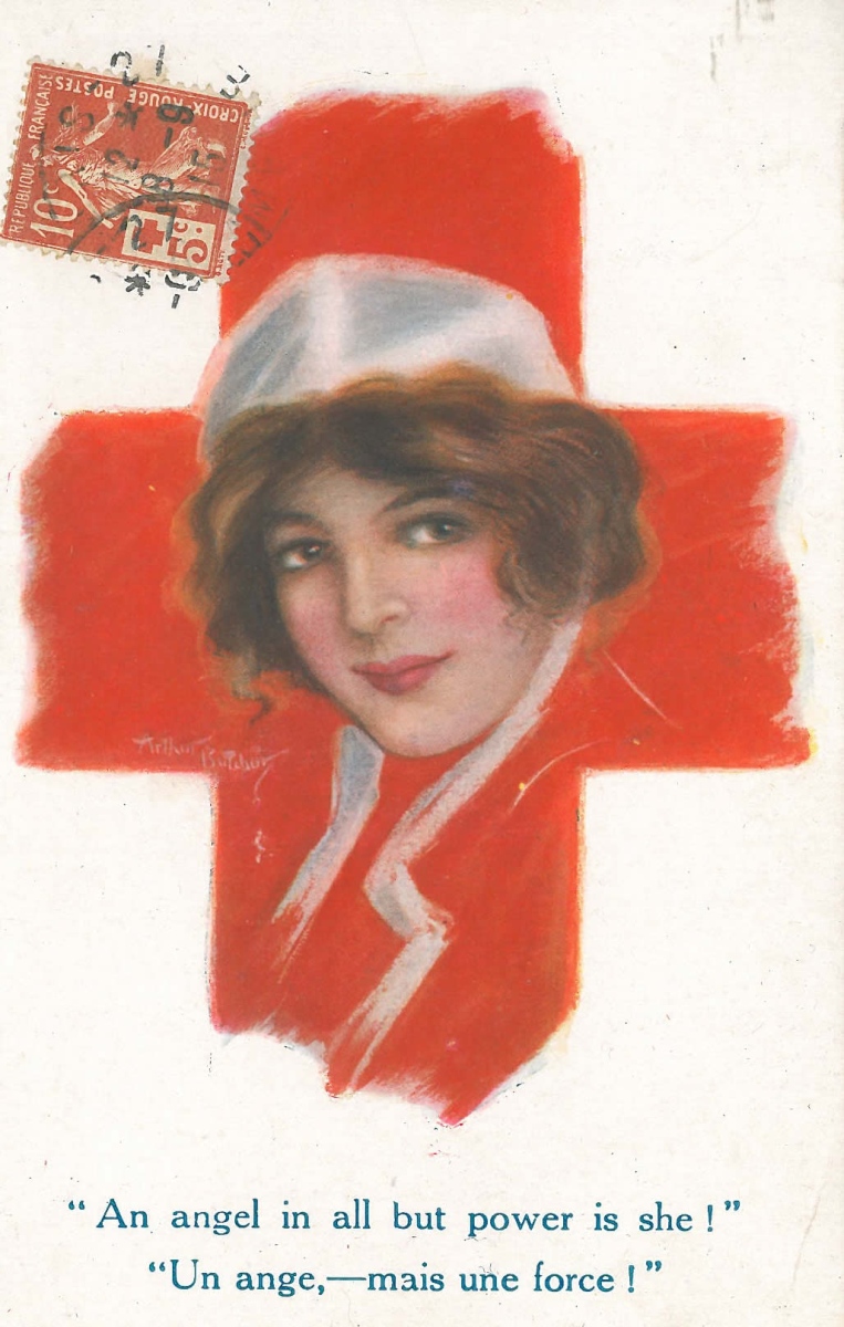 -Une présentant le portrait en couleur d'une infirmière de la Croix-Rouge sur une croix rouge. Titrée en anglais et en français "Un ange,-mais une force!". Timbre de la Croix-Rouge et cachet de 1915.