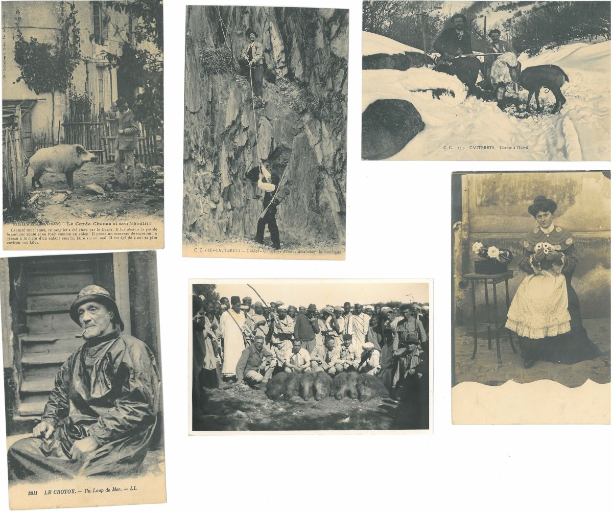 FRANCE. SIX CARTES POSTALES: Le Crotoy - Un Loup de Mer, femme au bouquet de fleurs, Merven (Vendée) - Le Garde-Chasse et son Sanglier, C.C. - 66. - CAUTERETS - Guides-Chasseurs d'Isards escaladant la montagne, C.C. - 134 - CAUTERETS - Chasse à l'Isard et trophée de chasse dans une colonie africaine. Fin XIXème, début XXème.