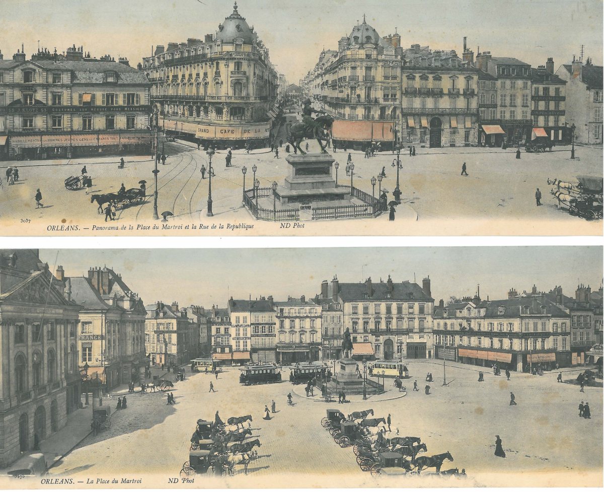 FRANCE. QUATRE CARTES POSTALES COULEUR PANORAMIQUES: "Orléans. - La Place du Martoi"; "Orléans. - Panorama de la Place du Martoi et la Rue de la République"; "Olivet. - Vue sur le Loiret prise du Pont (en amont)" et "La Source du Loiret".
