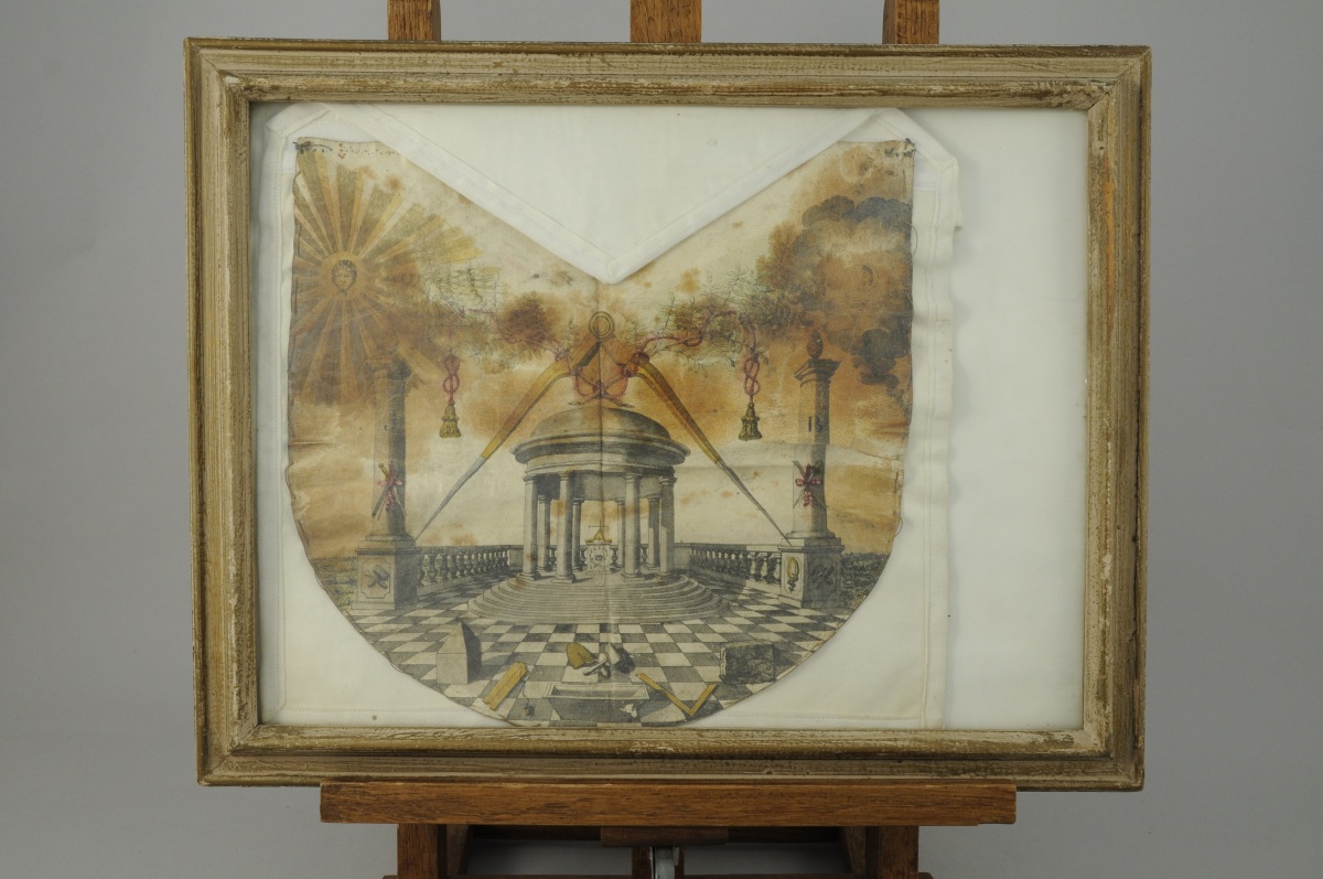 TABLIER dit de VOLTAIRE en peau teintée blanc imprimée d'un décor représentant un tempieto dorique et des attributs franc-maçons. Dans un cadre en bois peint. XIXème. Long. 29, Larg. 27,5 cm.