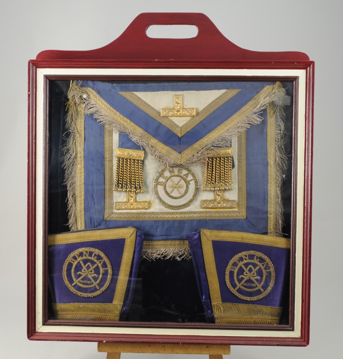 - TABLIER d'ASSISTANT MAITRE-MAÇON en peau teintée blanc, tissu cotelé bleu, fil doré, galons et franges. Faux rabat à galon orné d'un tau renversé. Deux attaches en métal doré auxquelles sont accrochés sept pendrillons terminés par des boules. Sur le plastron, un médaillon marqué "BENGAL", deux bâtons croisés, un philactère avec la mention "assistant" et deux taux renversés. Cordon de taille. XXème. Long. 37,5, Larg. 32 cm.