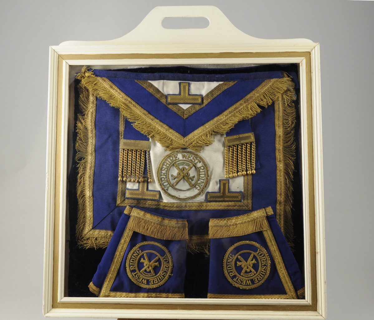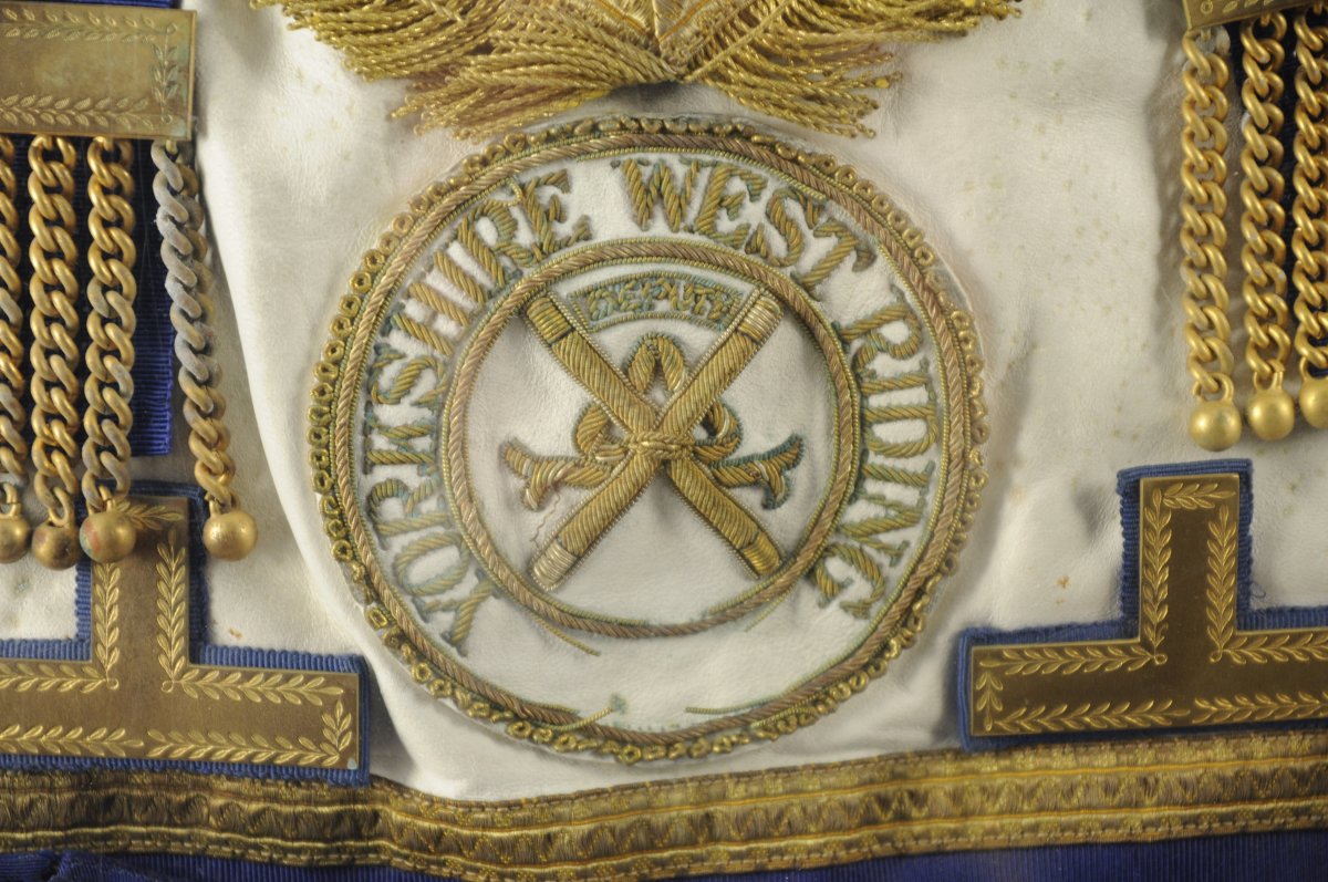 - TABLIER de DÉPUTÉ en peau teintée blanc, tissu cotelé bleu, fil doré, galons et franges. Faux rabat à galon orné d'un tau renversé. Deux attaches en métal doré auxquelles sont accrochés sept pendrillons terminés par des boules. Sur le plastron, un médaillon marqué "YORKSHIRE WEST RIDING", deux bâtons croisés, la mention "DEPUTY" et deux taux renversés. Cordon de taille. XXème. Long. 38, Larg. 32,5 cm.