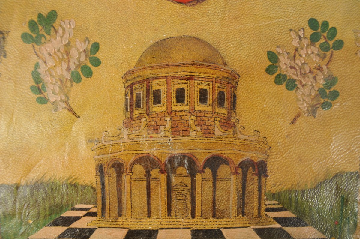 TABLIER de MAITRE dit "à l'acacia" en peau teintée polychrome. Sur le plastron, un tempieto sur un dallage noir et blanc encadré par deux colonnes corinthiennes et deux branches d'acacia. Faux rabat à galon avec étoile centrée d'un "G". XXème. Long. 27, Larg. 22 cm.