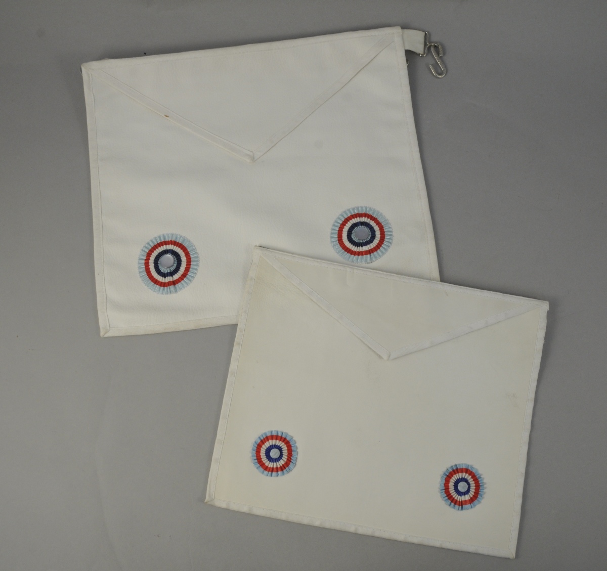 LOT de deux TABLIERS D'APPRENTIS en peau teintée blanc ornés de deux rosettes bleu, blanc et rouge. Rabat et cordon de taille. XXème. Le plus grand, Long. 36,6, Larg. 31,4 cm.