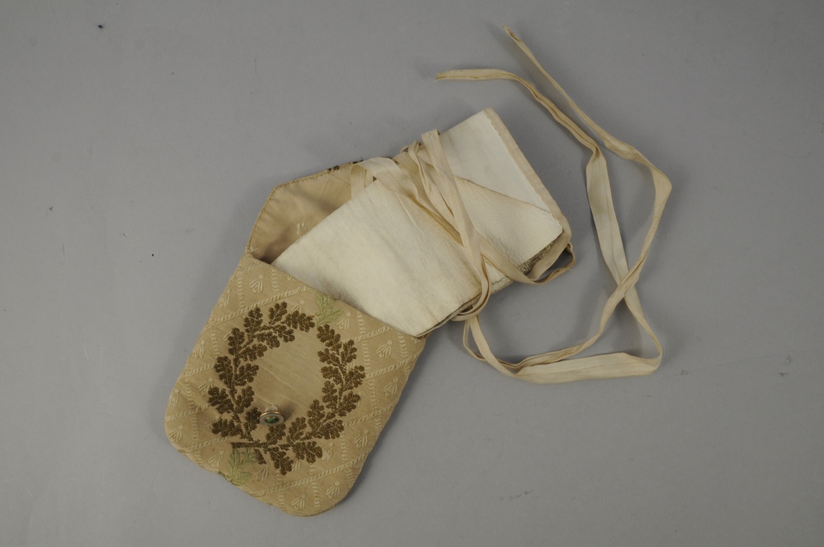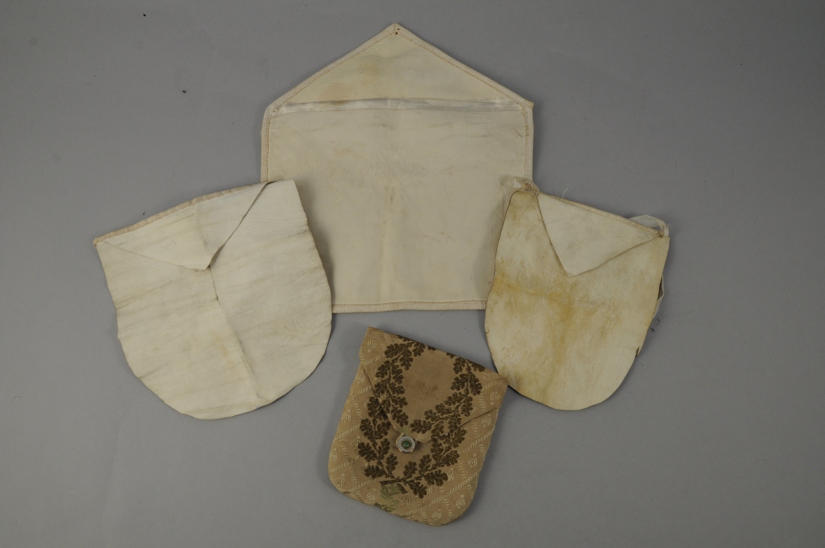 LOT comprenant TROIS TABLIERS D'APPRENTIS en peau teinté blanc et une POCHETTE en tissu brodé de couronnes de feuilles de chêne en fil vert et doré. Début XXème. Long. 23,5, Larg. 26,5 cm, pour le plus grand.