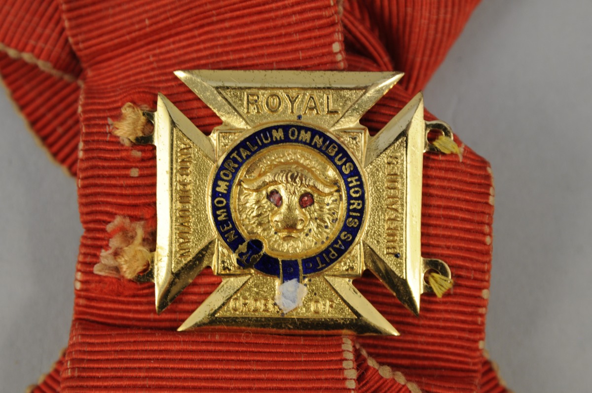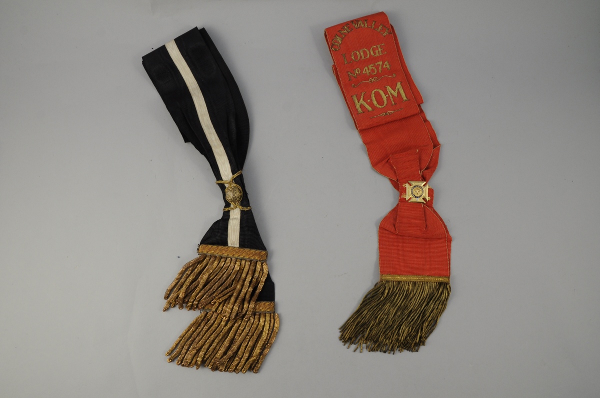 - COLLIER de la loge N°4574 de Colne Valley en tissu cotelé rouge, fil doré et frange en fil métallique doré. Brodé "K.O.M". Fermé par une Croix pâtée centrée d'un muffle de buffle en métal doré et émaillée bleu, marqué de la devise "NEMO MORALIUM OMNIBUS HORIS SAPIT" et "ROYAL / ORDER OF / ANTEDILUVIAN / BUFFALOES". XXème. Haut. 92,5 cm.