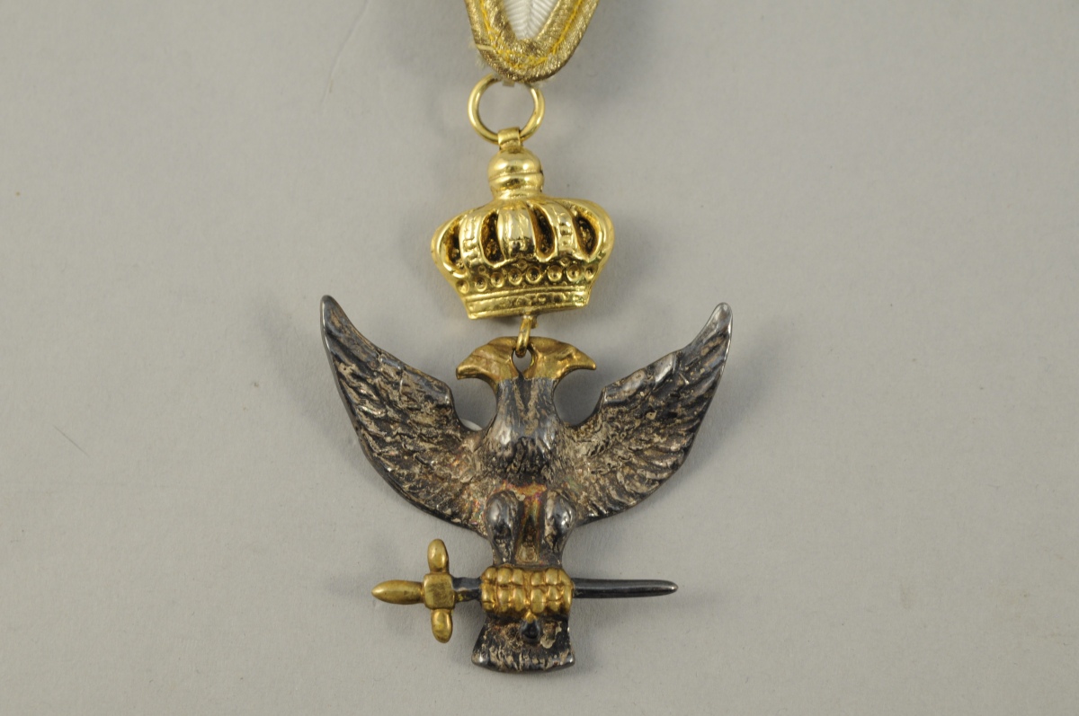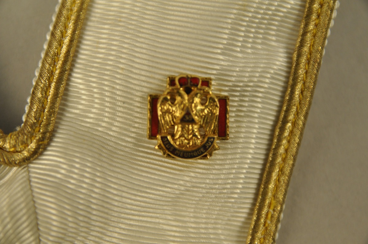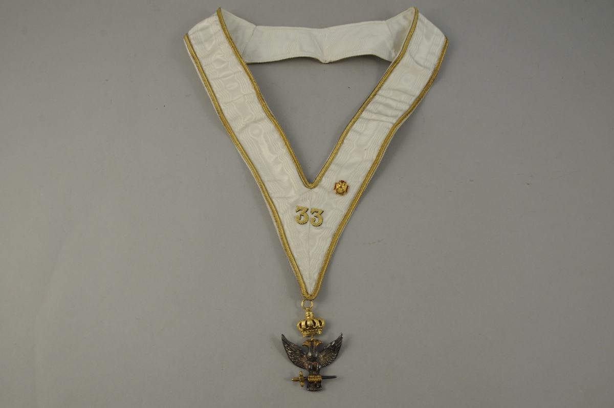 COLLIER de SOUVERAIN GRAND INSPECTEUR GÉNÉRAL, 33ème degré du Rite Écossais Ancien et Accepté. Moire blanche et fil doré. Le chiffre 33 brodé sur la pointe et un petit insigne représentant un aigle bicéphal couronné et la devise "DEUS MEUMQUE JUS". Pendentif en argent et métal doré représentant un aigle bicéphal couronné portant une épée. XXème. Haut. 55,3 cm.