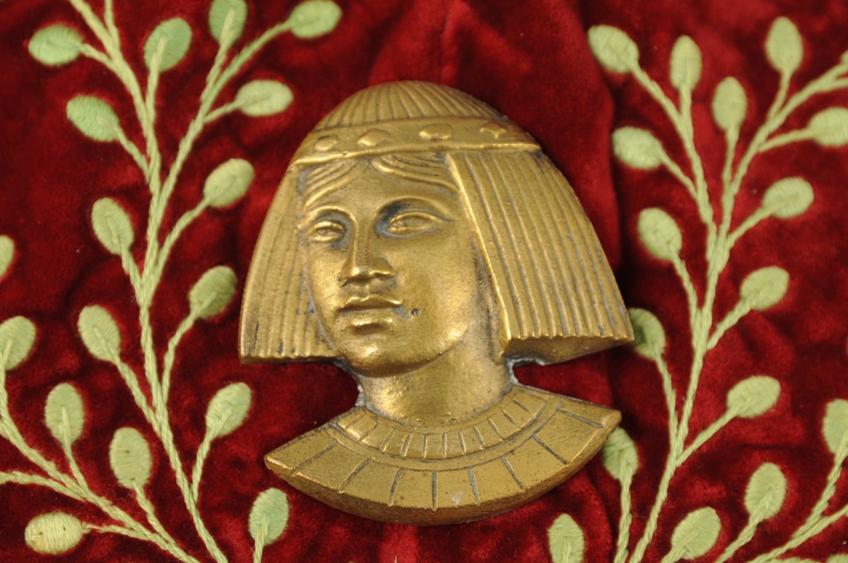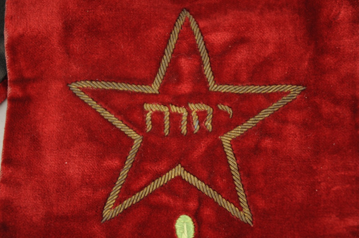 COLLIER de GRAND ÉLU PARFAIT ET SUBLIME MAÇON de la Grande Loge de Memphis en velours rouge. Étoile brodée centrée de caractères hébraïques et feuillages d'acacia brodés de fil vert entourant une broche en bronze représentant un visage égyptien. XXème. Haut. 54,5 cm.