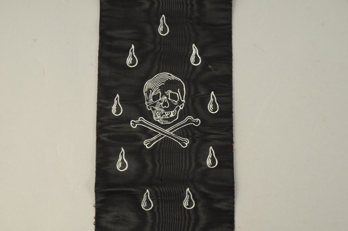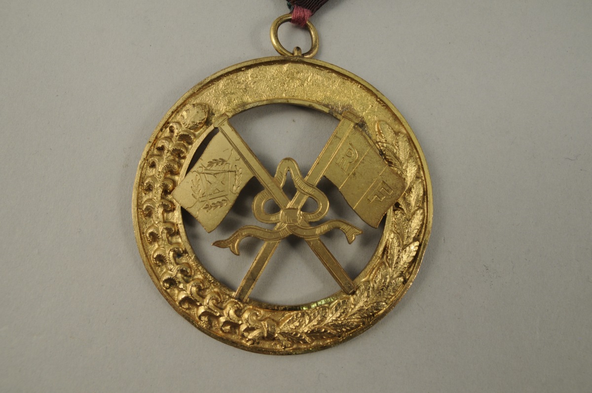 COLLIER en moire bleu et bordeaux, strass et fil doré. Décor d'étoiles, corde nouée, globe, perpendiculaire, temple, compas, équerre et feuillages. Marqué "J.B". Rosette bordeaux et médaille en métal doré représentant deux drapeaux rubanés dans une couronne de feuillages. Début XXème. Haut. 87,5 cm.