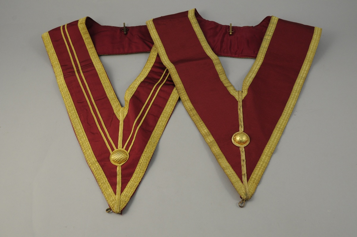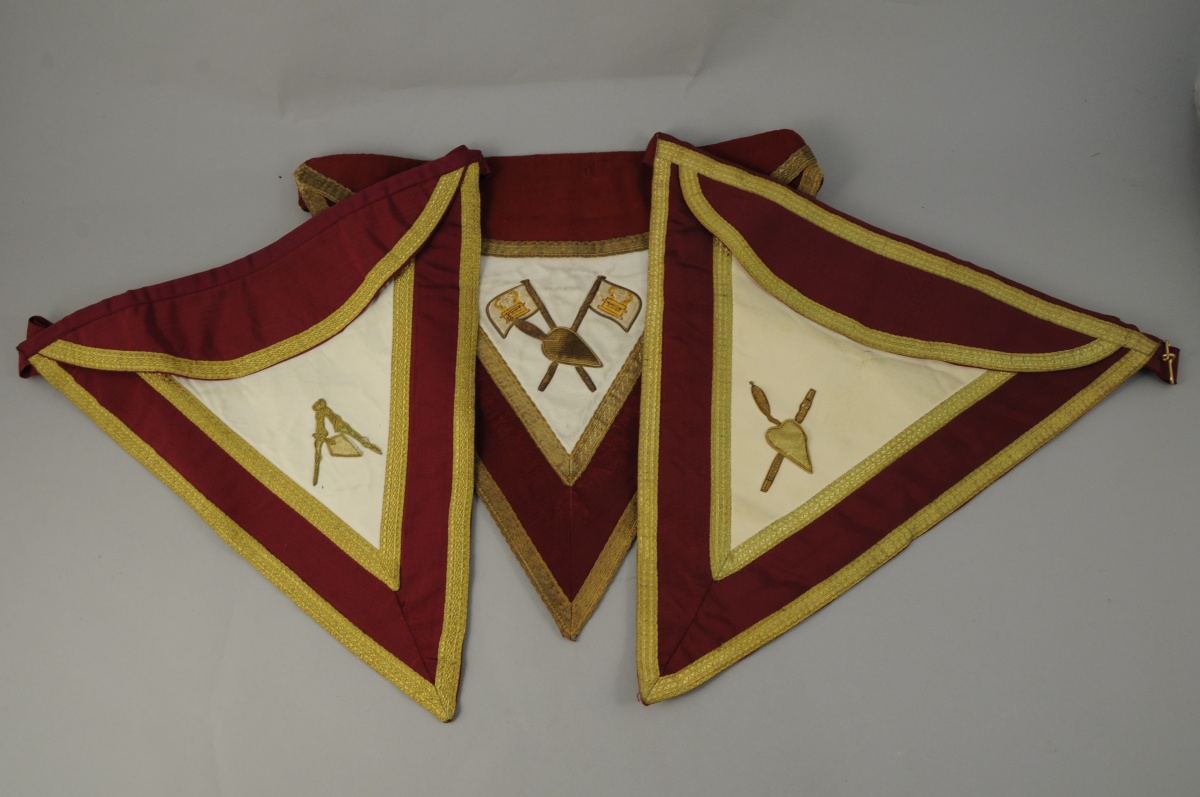 - TROIS TABLIERS triangulaires à rabat en peau teintée blanc, tissu cotelé bordeaux, galons et fil doré. Sur l'un, deux drapeaux et une truelle. Rite Supérieur. Cordon de taille. XXème. Haut. 41,5 cm.