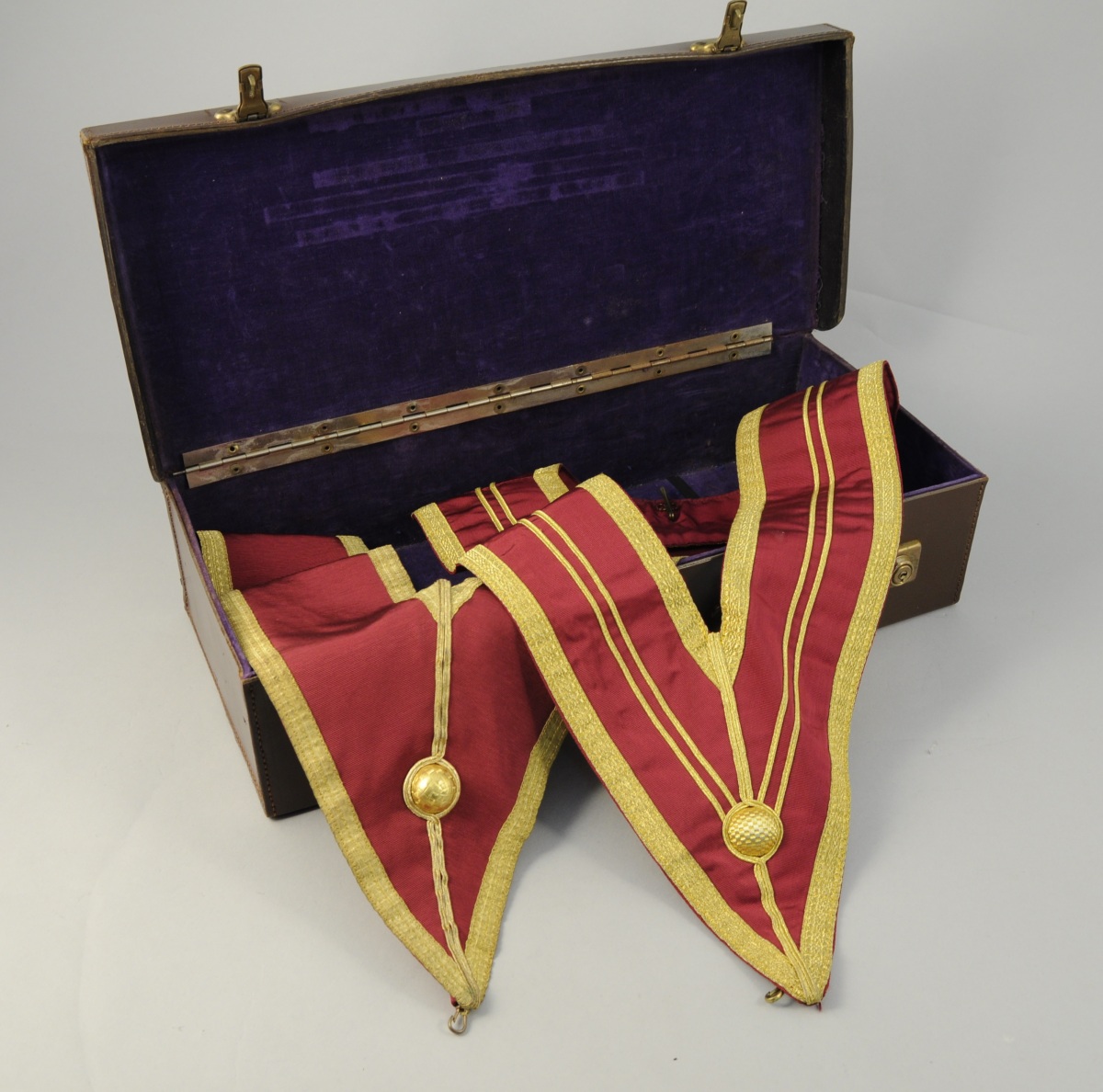 - DEUX COLLIERS en tissu cotelé bordeaux, galons et fil doré. XXème. Haut. 54,5 cm.
