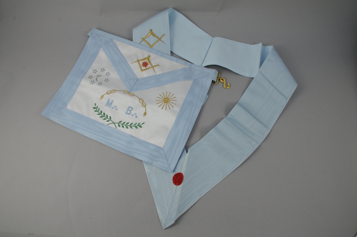 - TABLIER en peau teintée blanc, moire bleu ciel, fil doré et de couleur. Faux-rabat à galon orné du compas et de l'équerre centrés d'une étoile. Sur le plastron, un décor d'étoiles, lune, soleil, corde nouée et feuillages. Marqué "M.B". Cordon de taille. XXème. Long. 39,3, Larg. 31 cm.