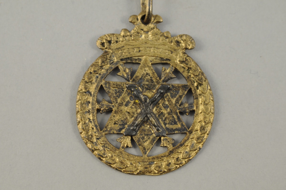 - COLLIER en moire blanche. Croix pâtée rouge brodée. Médaille ajourée d'une étoile centrée de Saint-André crucifié et d'un "H". XXème. Haut. 76,5 cm.