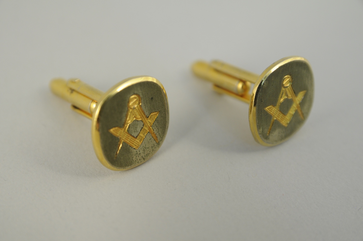 PAIRE de BOUTONS de MANCHETTES carrés à bords arrondis plaqués or. Décor gravé du compas et de l'équerre. XXème.