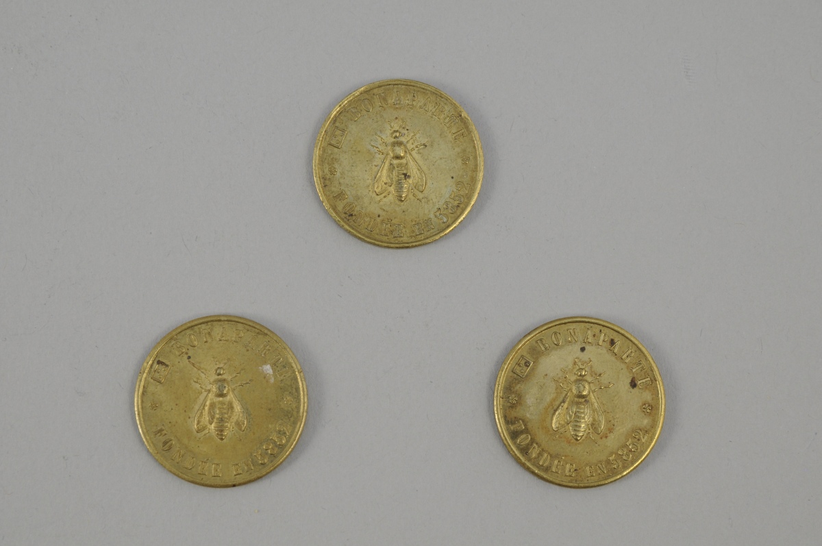 TROIS JETONS de PRÉSENCE en cuivre de la loge Bonaparte, fondée en 5852. Abeille impériale sur l'avers. Compas et équerre centrés d'un "G", couronne de feuillages et trois étoiles sur le revers. Diam. 2,2 cm.