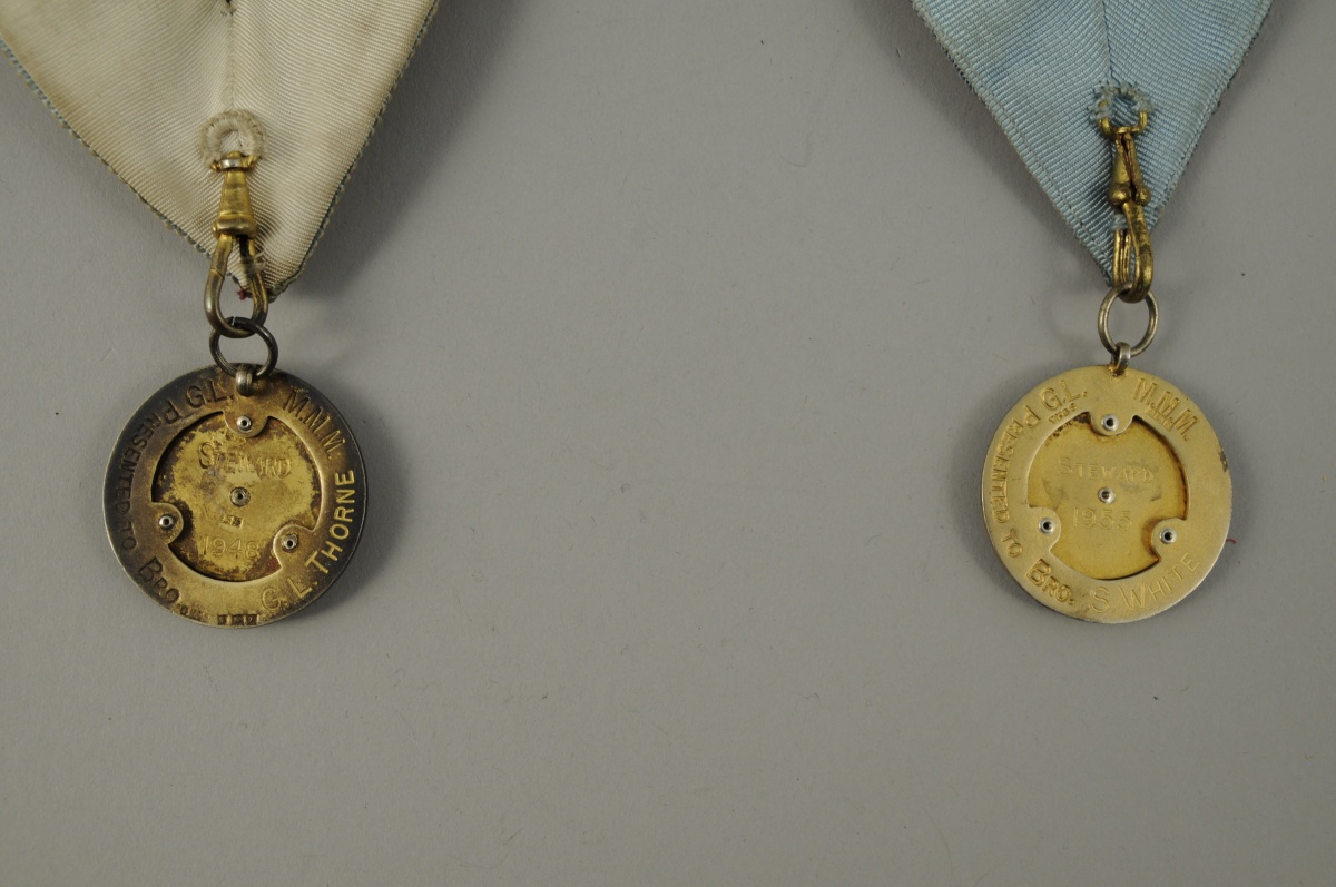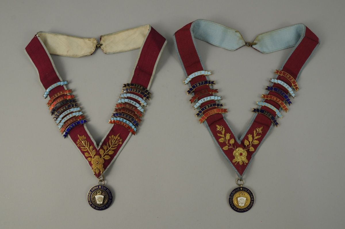 DEUX COLLIERS de Lamarque. Médaille en argent doré et émaillé bleu et blanc, décor appliqué de l'emblème de la loge entouré de la devise "QUI DILIGIT DEUM DILIGAT ET FRATREM SUUM". Attribués aux frères G.L Thorne et S. White. Cordon brodé au fil doré d'une rose et de feuillages. 18 barettes datées de 1939 à 1956, sur l'un et 12 barettes datées de 1968 à 1979, sur l'autre. Diam. de la médaille 3,8 cm.