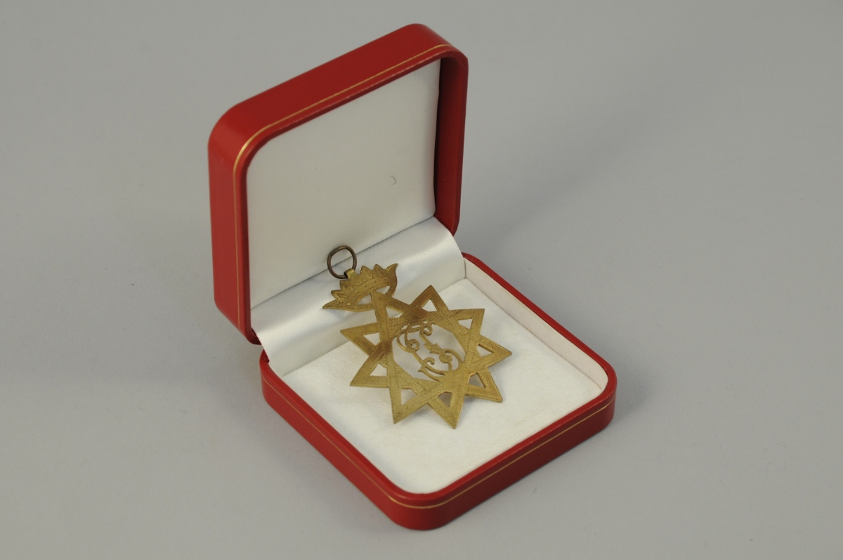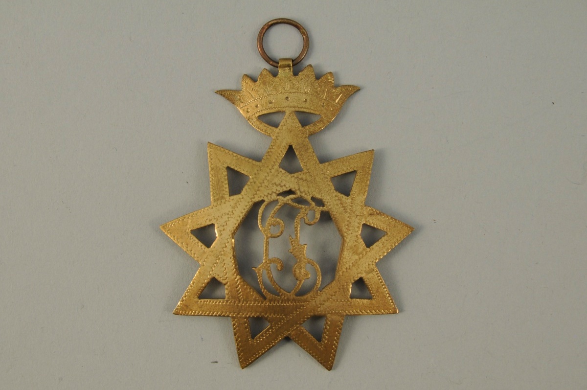 INSIGNE du Conseil de l'Ordre du Grand Orient en métal doré. Début XXème. Haut. 8,2 cm. Dans un écrin.