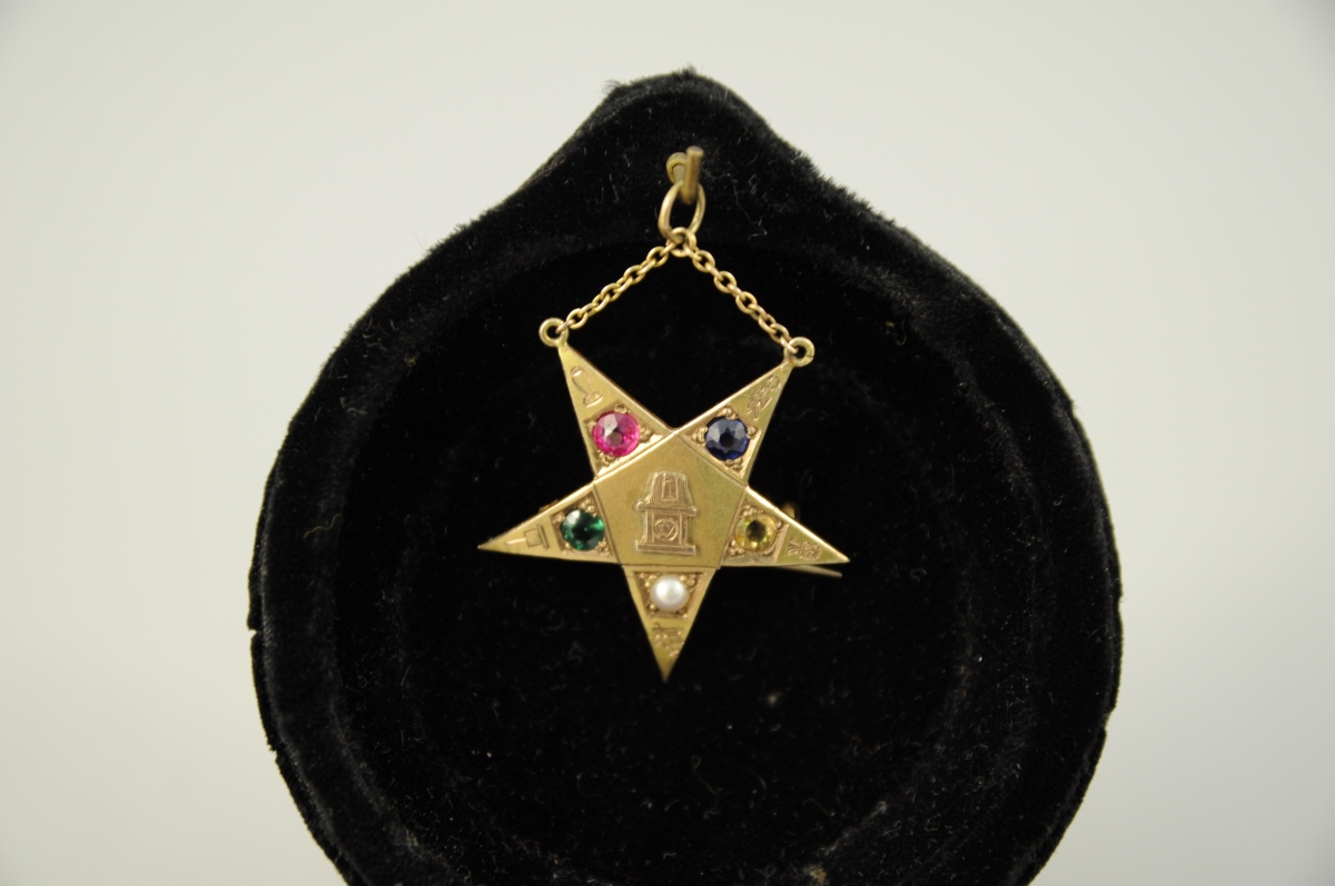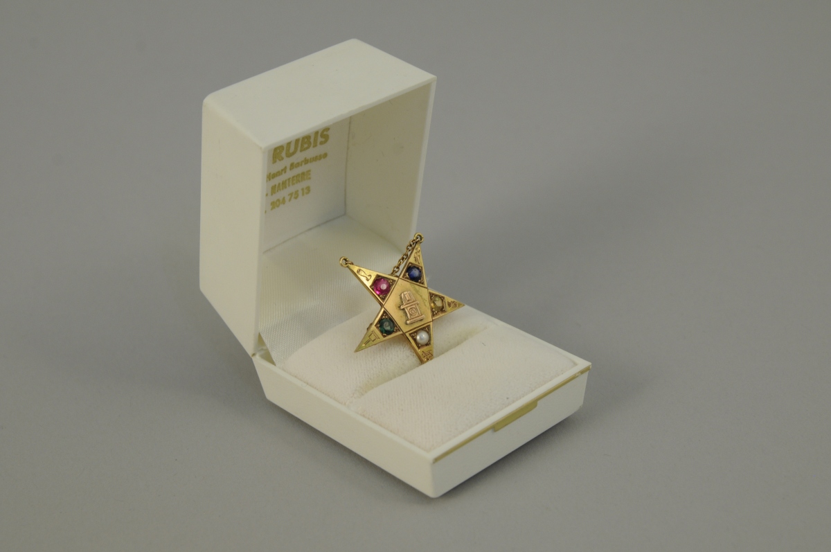 PETITE BROCHE en forme d'étoile en métal plaqué or et pierres de couleur. Poinçon anglais 9 k à l'arbre. XXème. Haut. 3 cm. Dans un écrin de la maison "Au Rubis" à Nanterre.