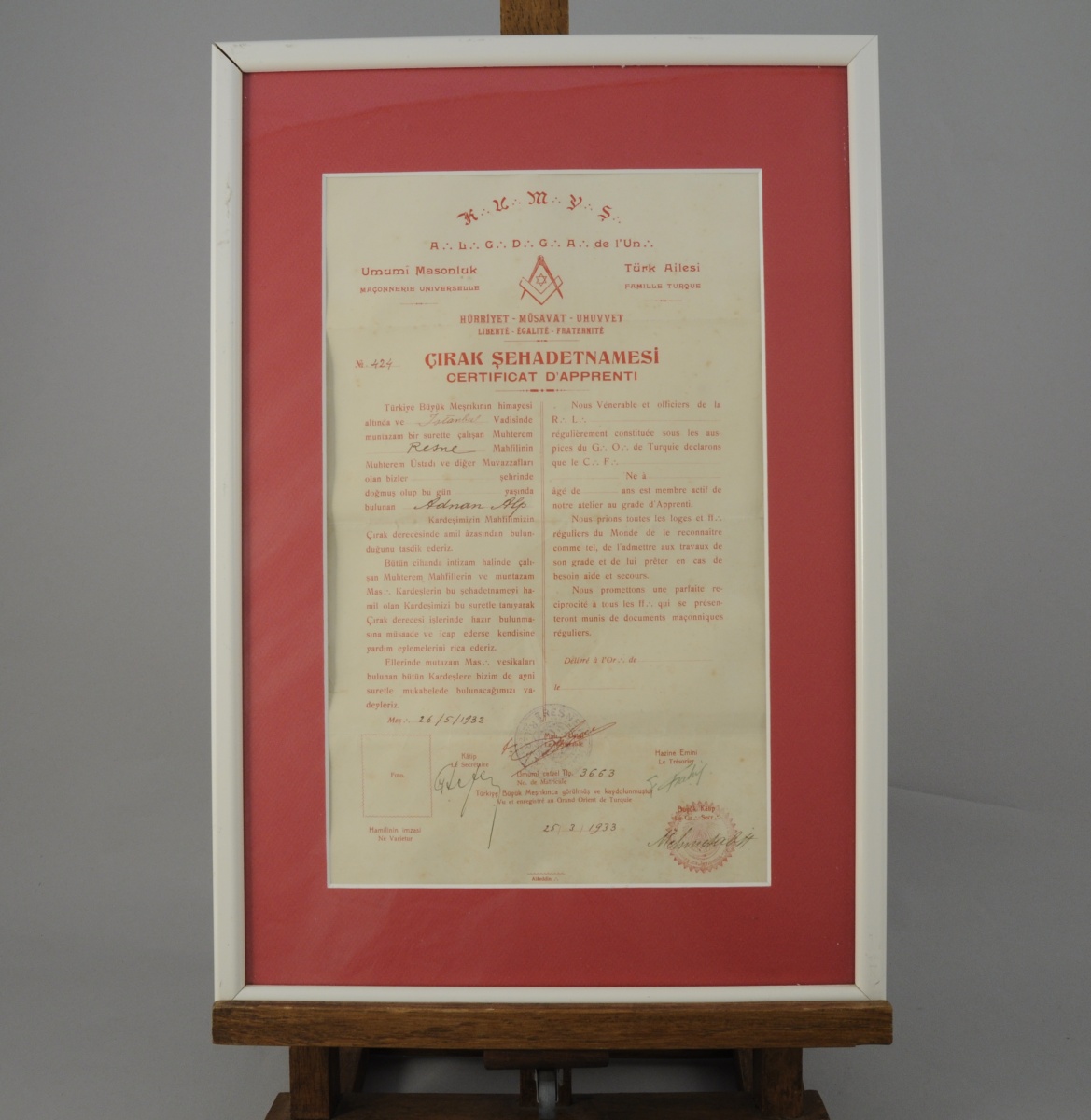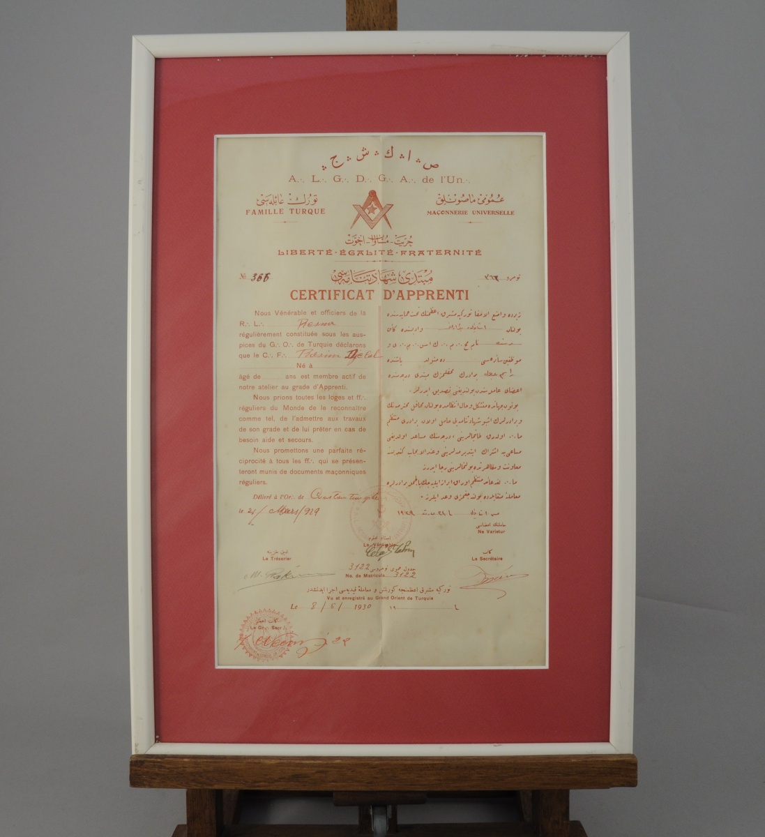 ENSEMBLE de TROIS CERTIFICATS d'apprentis du Grand Orient de Turquie décernés en 1924, 1930 et 1933. Cadres en bois laqué blanc. 20,8 x 34,3 cm.