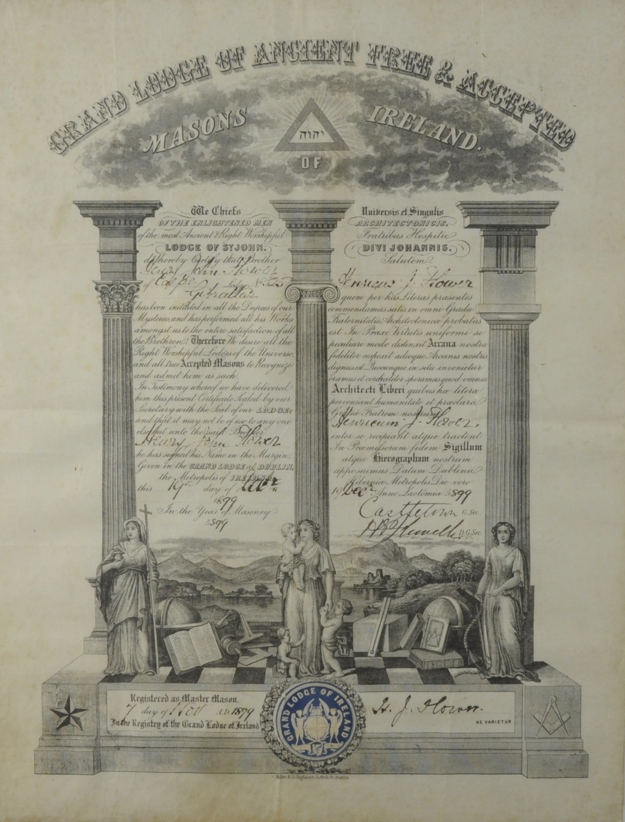 DIPLÔME de MAÎTRE de la loge de SAINT JOHN du rite ancient, libre et accepté irlandais, décerné à Henry John HOWER le 19 décembre 1899. 32,5 x 42,8 cm.
