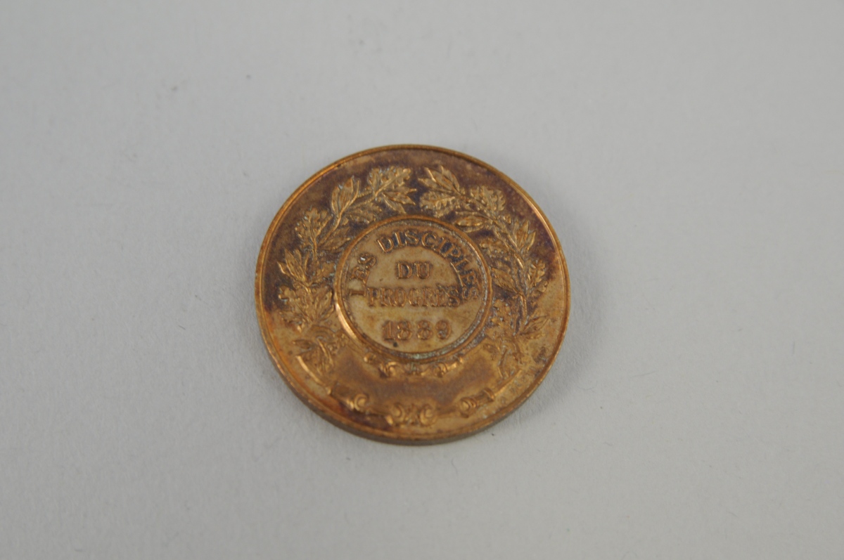 JETON de PRÉSENCE en cuivre de la loge des Disciples du Progrès. Nom de la loge, daté 1889 et feuillages, sur l'avers. Sur un fond rayonnant, médaillon ovale ailé centré d'une étoile et d'une pyramide et entouré de la devise "Liberté - Égalité - Fraternité". Diam. 2,6 cm.