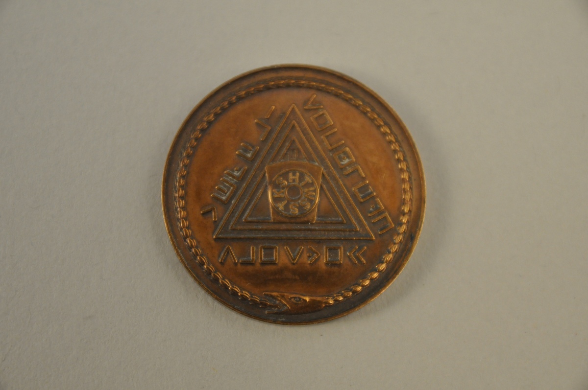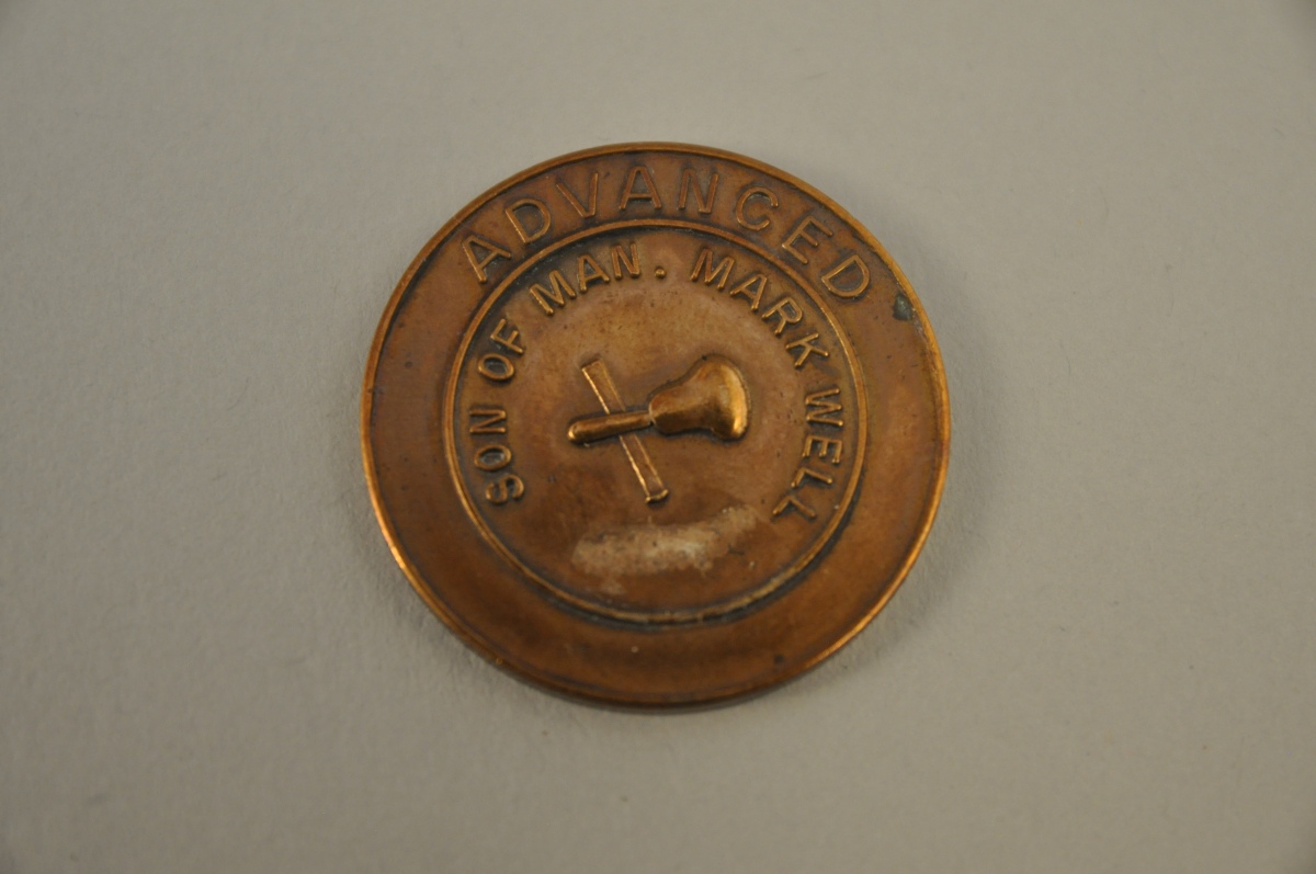 JETON de PRÉSENCE britannique en cuivre. Marqué "ADVANCED / Son of Man. Mark Well" et orné d'une règle et d'une mailloche, sur l'avers. Marqué "KSHTWSST" dans trois pyramides imbriquées entourées de devises en alphabet maçonniques, le tout entouré d'un serpent se mordant la queue, sur le revers. Diam. 3,1 cm.