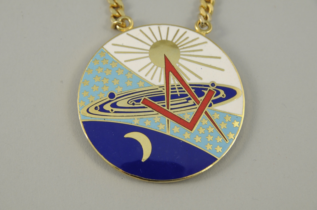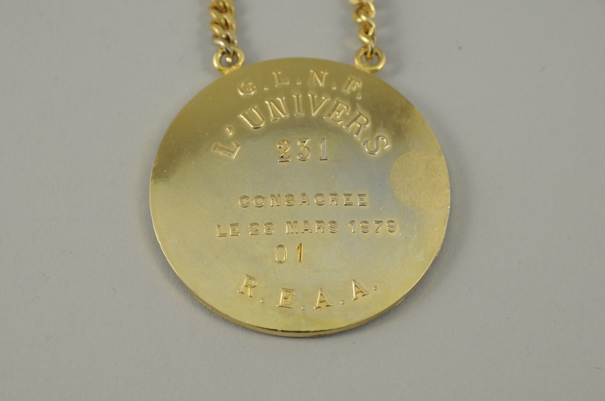 MÉDAILLE en métal doré et émaillé polychrome de la Grande Loge Nationale Française. Décor représentant le système solaire ainsi que le compas et l'équerre. Marquée au revers "G.N.L.F / L'UNIVERS / 231 / Consacrée le 28 Mars 1979 / 01 / R.E.A.A ". Chaîne en métal doré. XXème. Diam. 54 mm.