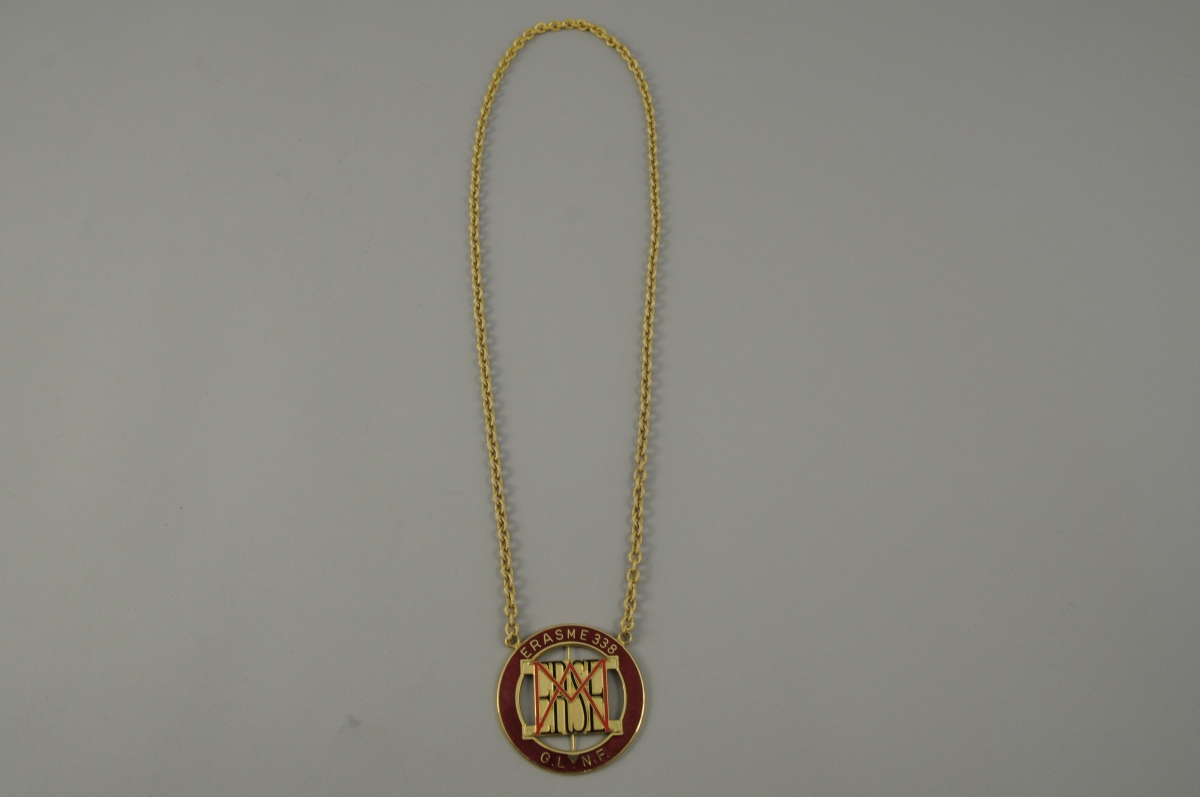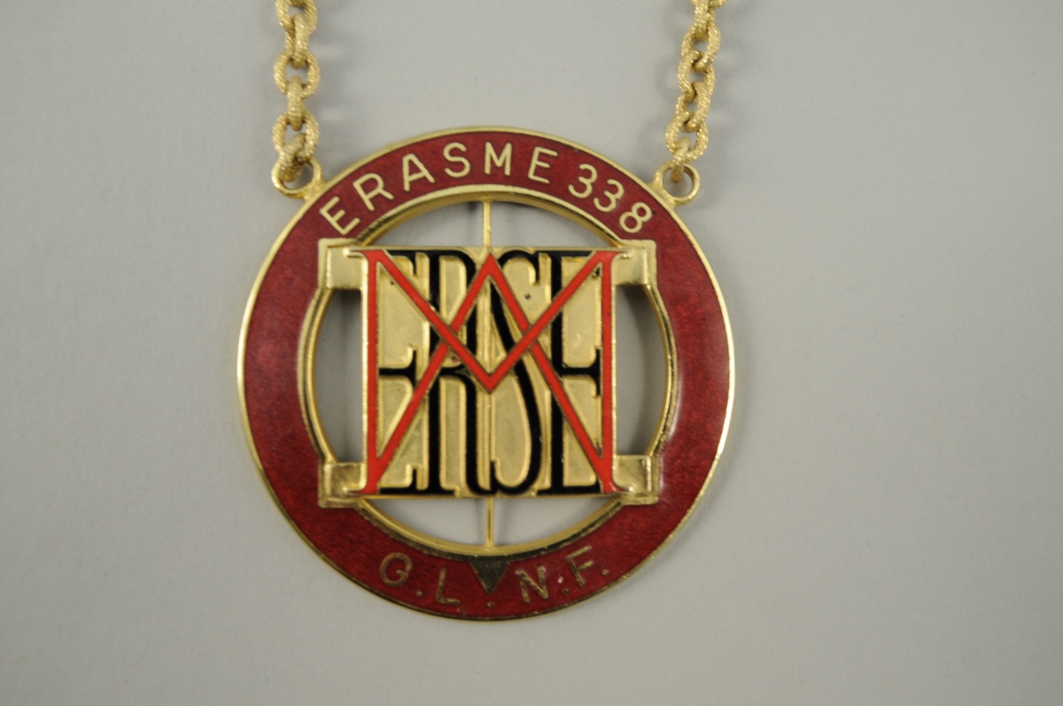 MÉDAILLE en métal doré et émaillé rouge et noir de la Grande Loge Nationale Française. Décor ajouré d'un carré marqué "ÉRASME" et "ÉRASME 338 / G.N.L.F"sur le bord. Marquée au revers " A.L.G.D.D.G.A.D.L'U. / R.E.A.A / Consacrée le / 23 JUIN 5983 / 002". Chaîne en métal doré. XXème. Diam. 67 mm.