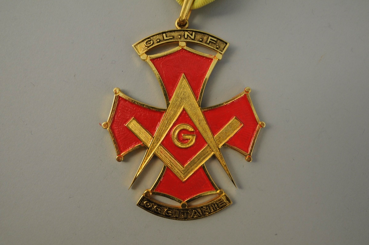 LOT de QUATRE MÉDAILLES en forme de croix patée en métal doré et émaillé rouge. L'une marquée "G.L.N.F. / OCCITANIE". Cordons. XXème. Haut. 85 mm, pour la plus grande.