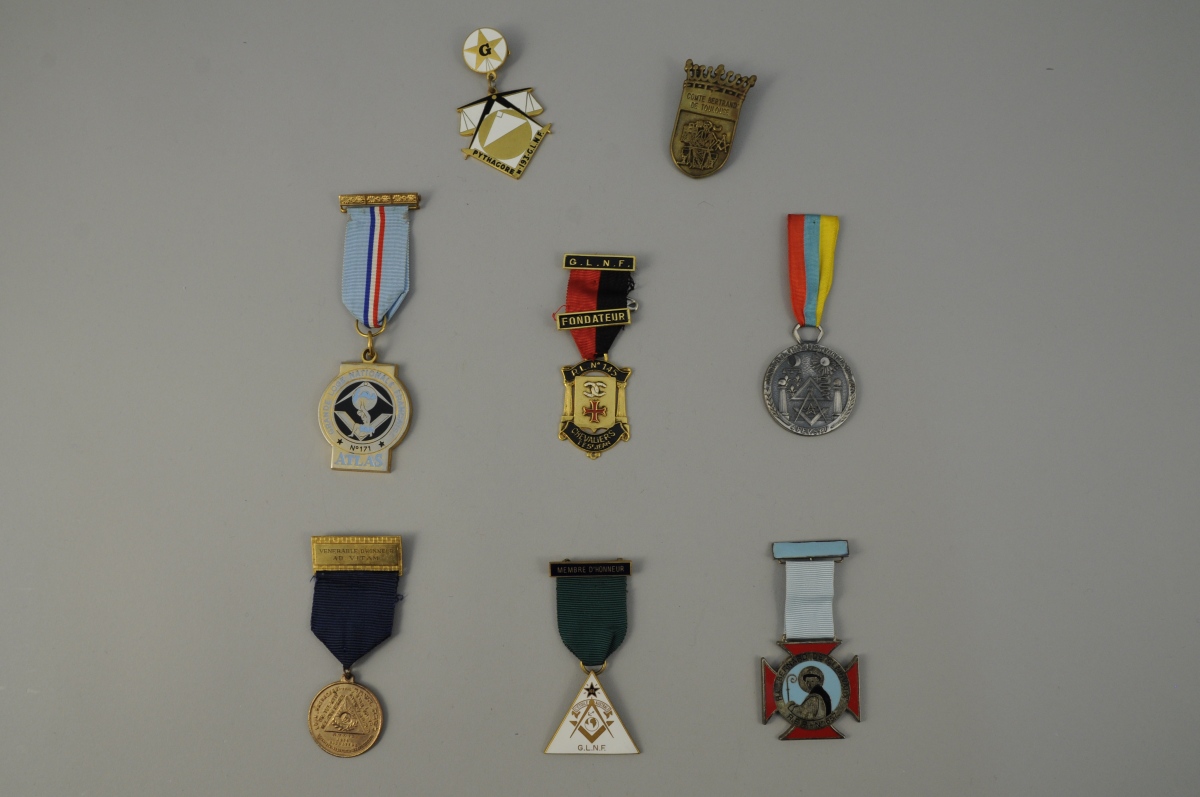 LOT de HUIT MÉDAILLES françaises. Loges Chevaliers de Saint Jean, Bernard de Clairvaux, Charles d'Orléans, Comte Bertrand de Toulouse, Din Israel, Atlas, L'Étoile Australe et Pythagore. Bronze, cuivre, métal doré, argenté et émail. Rubans. XXème. Haut. 59 mm, pour la plus grande.