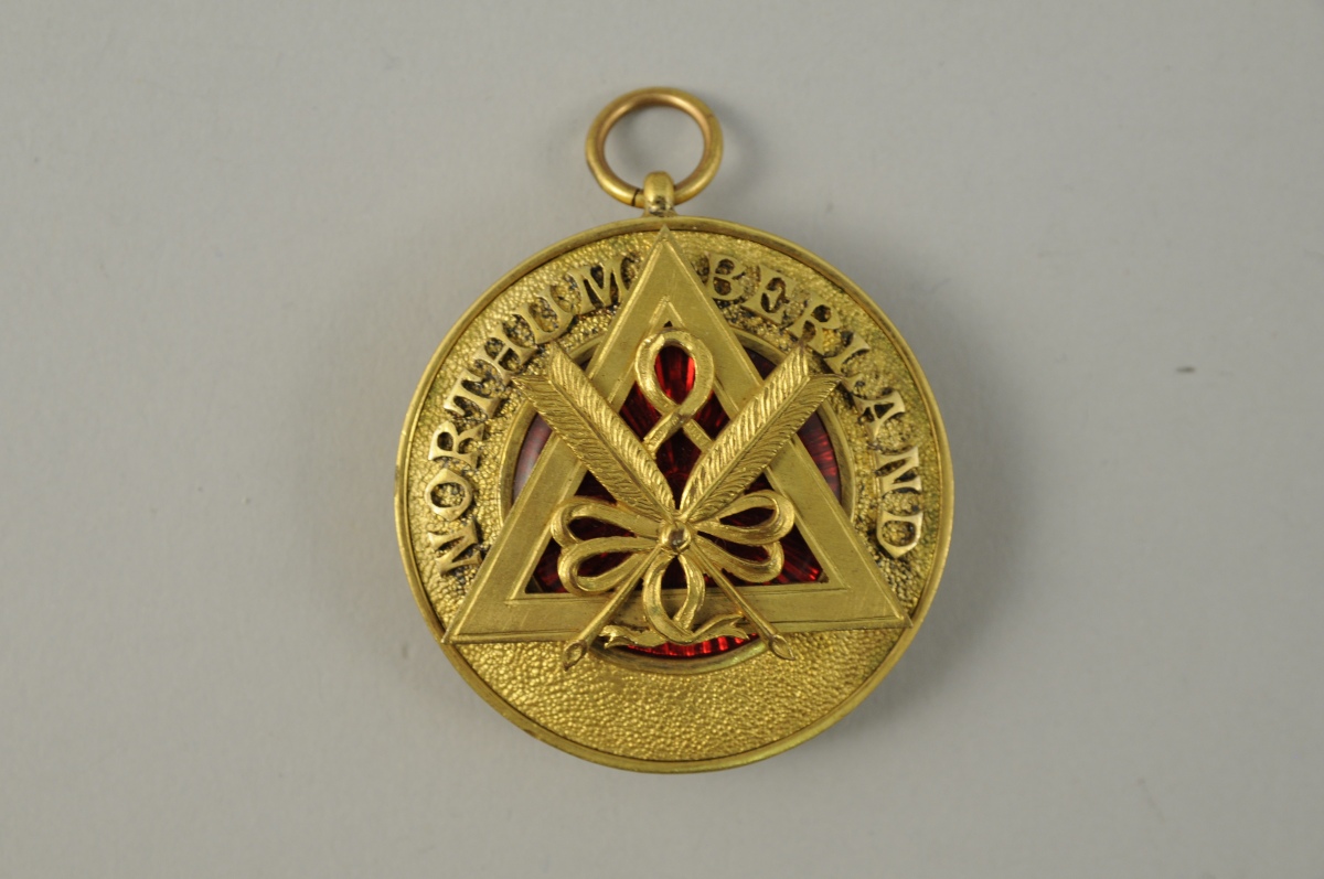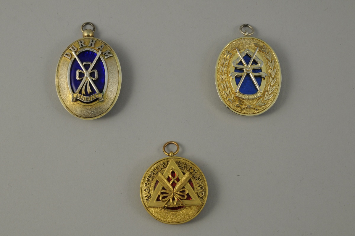 LOT de TROIS MÉDAILLONS en argent et métal doré. Décor appliqué de deux bâtons ou de deux flèches croisés et rubanés. Deux portant la mention "ASSISTANT" et marqués "DURHAM" et "NORTHUMBERLAND". XXème. Haut. 5,4 cm, pour le plus grand.