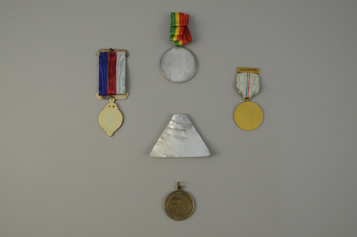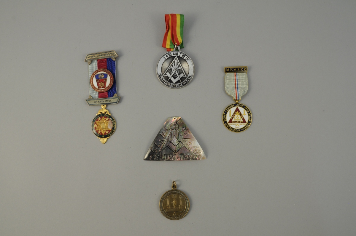 LOT de QUATRE MÉDAILLES et UN INSIGNE. G.L.N.F District du Sénégal, Loge Mount Lebanon de Chateauroux, Grand Chapitre d'Afrique du Sud, Grande Loge du Massachussetts et insigne en nacre G.N.L.F Te-Ora Tahiti. Métal argenté, doré et émail. Rubans et cordon. XXème. Haut. 5,8 cm, pour le plus grand.
