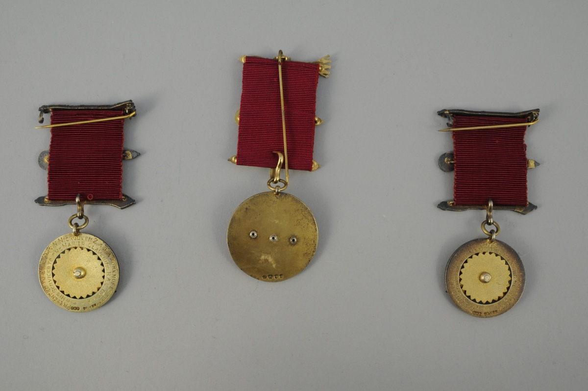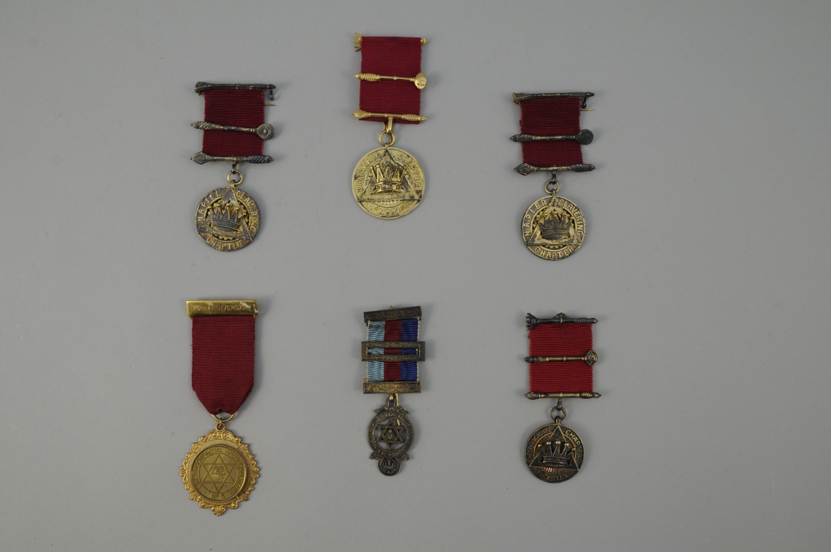 LOT de SIX MÉDAILLES de l'Arche Royale. Loges Napier Clavering, Britanic Chapter, Weste lancashire et Linlithgow Royal. Argent doré et métal doré. Rubans. XXème. Haut. 10,6 cm, pour la plus grande.