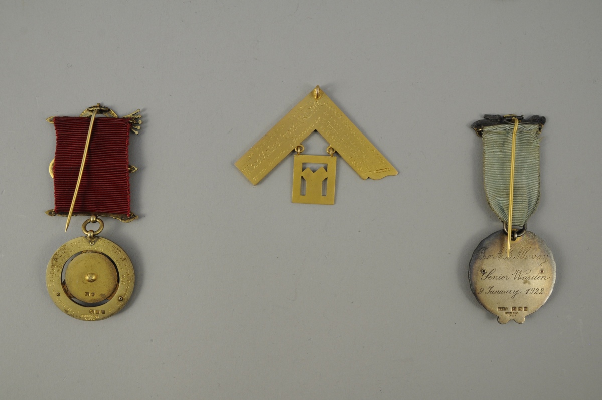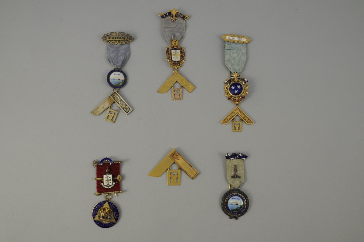 LOT de CINQ MÉDAILLES. Deux médailles loge Godefroi de Bouillon Chapter N°6, deux médailles loge de Calais et une médaille loge Saint Wilfried. Argent et métal doré. Rubans. Années 1920-1930. Haut. 13,8 cm, pour la plus grande.
