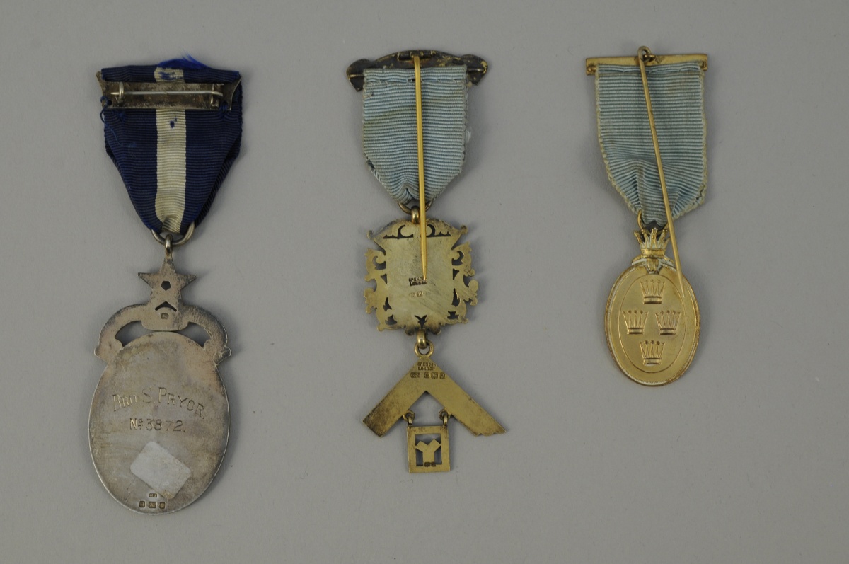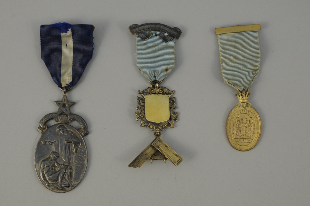 LOT de TROIS MÉDAILLES anglaises dont une provenant de la London Lodge. Argent et métal doré. Rubans. XXème. Haut. 10,7 cm, pour la plus grande.