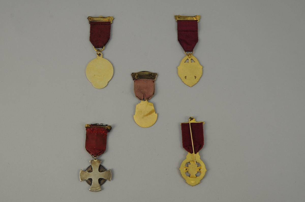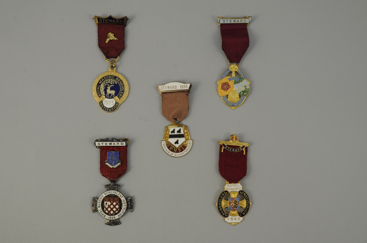 LOT de CINQ MÉDAILLES de steward de la Royal Masonic Benevolant Institution. Argent, métal doré et émail. Rubans. XXème. Haut. 9,3 cm, pour la plus grande.