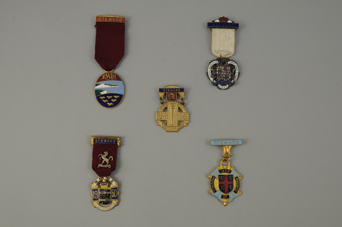 LOT de CINQ MÉDAILLES de steward comprenant deux médailles de la Royal Masonic Benevolant Institution, trois médailles de la Royal Masonic Institution for Boys et for Girls. Argent, métal doré et émail. Rubans. XXème. Haut. 10,8 cm, pour la plus grande.