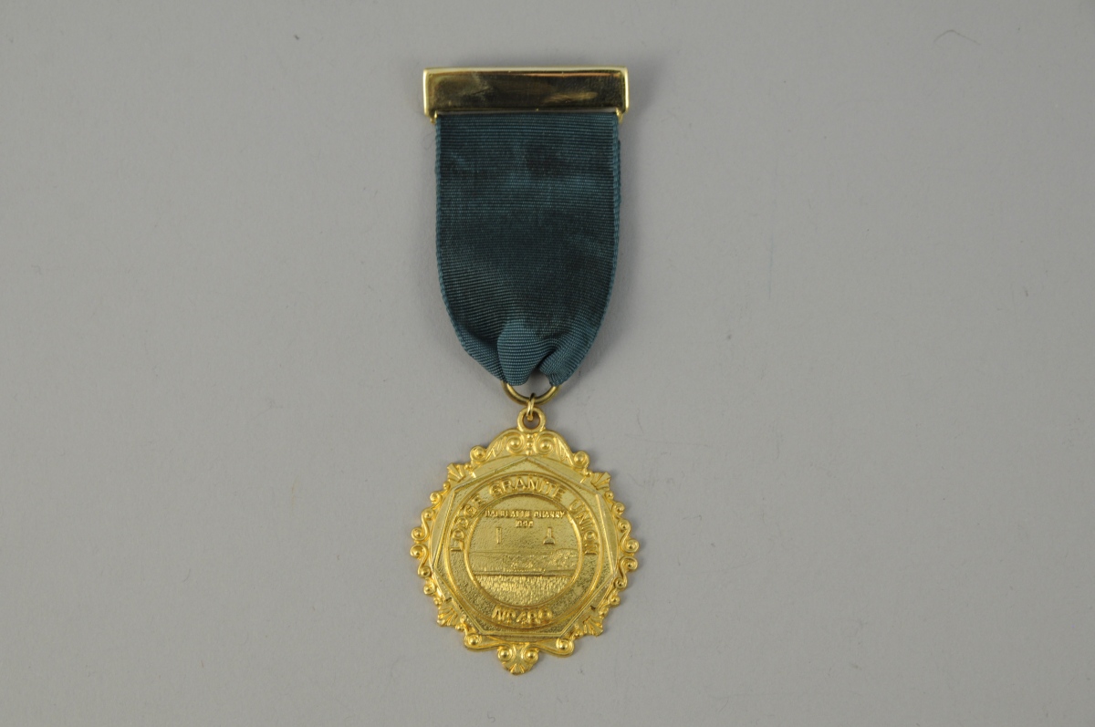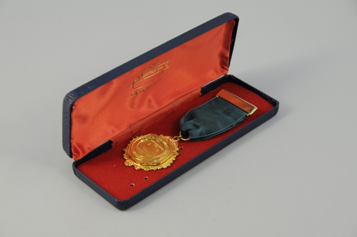 MÉDAILLE de la loge Granite Union, marquée "Dalbbattie Quarry". Métal doré. Ruban vert. datée 1990. Haut. 10,8 cm. Dans un écrin de la maison Diamond Cut.