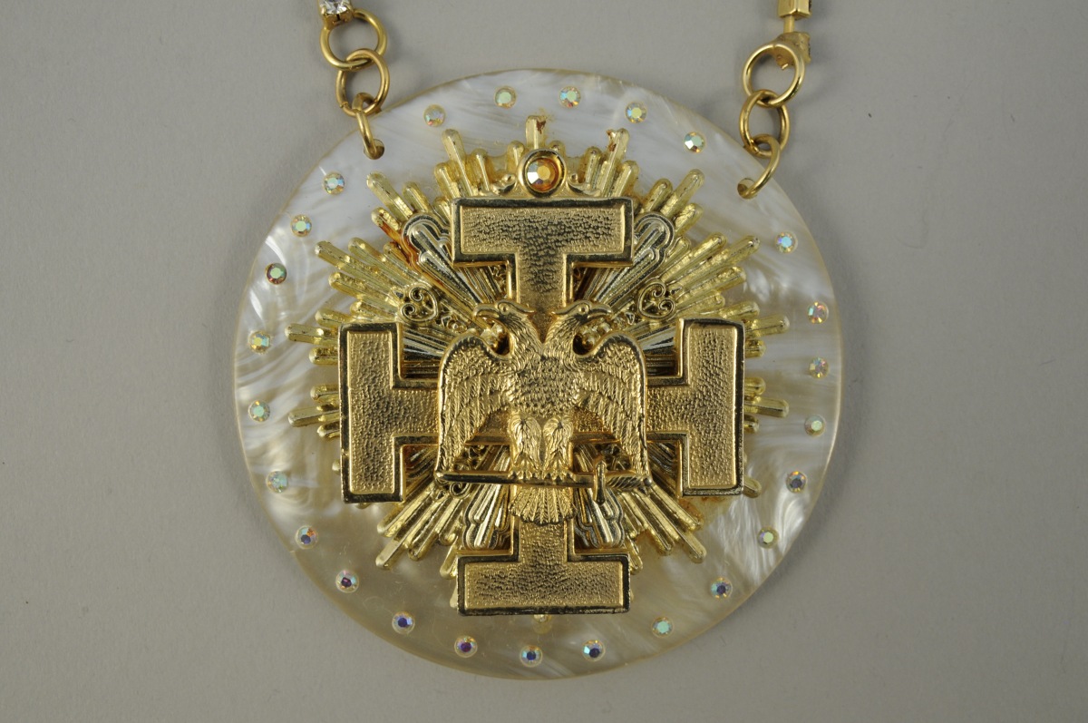 COLLIER en métal doré et imitation nacre. Médaillon à décor appliqué d'une croix à béquilles rayonnante centrée d'un aigle à deux têtes perché sur une épée. Strass et pierres de couleur. Chaine en métal doré et strass. XXème. Diam. 7,9 cm.