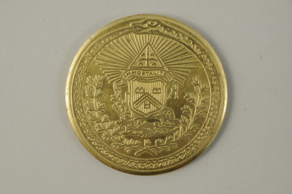 MÉDAILLE en bronze doré. Décor d'un blason et d'attributs maçonniques sommés de l'Oeil de la Providence. Sur le bord, un serpent se mordant la queue. Marquée au revers "G.L.N.F / R.E.A.A / GRANDE LOGE ANGLAISE 204 / N°2 / O. DE BORDEAUX / 1932-1982". Diam. 5 cm.