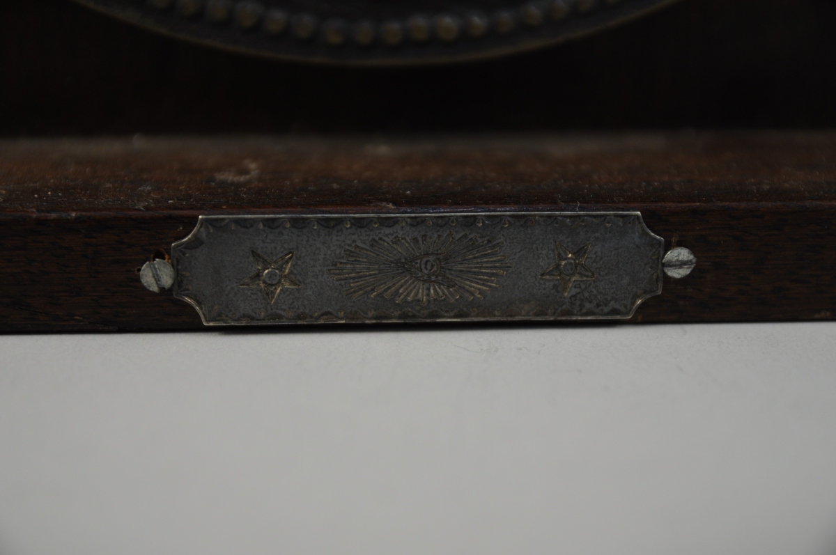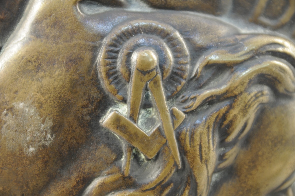 GRANDE MÉDAILLE en bronze à patine brune représentant la Marianne de Jacques FRANCE de profil. Elle porte un bonnet phrygien dont la cocarde est ornée du compas et de l'équerre. Marquée "REP. MAC de Jacques France". XXème. Diam. 17,4 cm. Fixée sur un socle en bois.