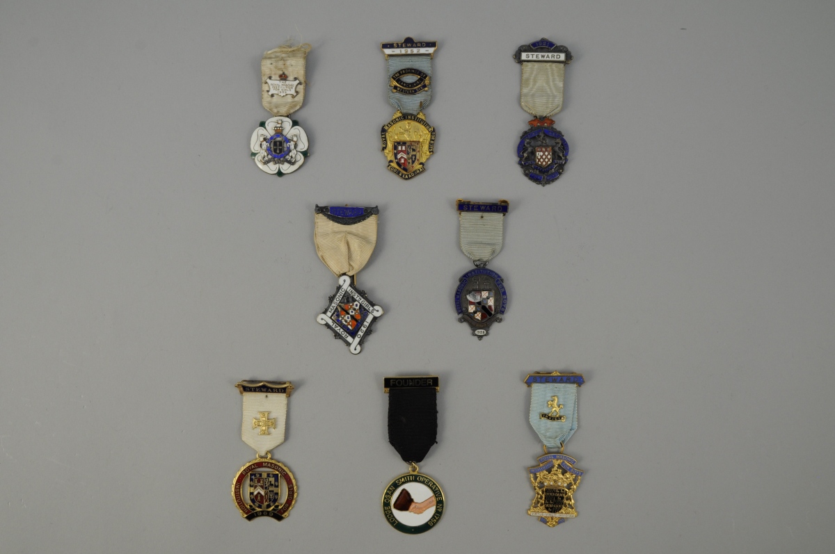 LOT de HUIT MÉDAILLES anglaises dont sept de steward et une de fondateur de la loge Ogan Smith Operative. Argent, métal doré et émail bleu. Rubans. XXème. Haut. 9,5 cm, pour la plus grande. (manque une attache)