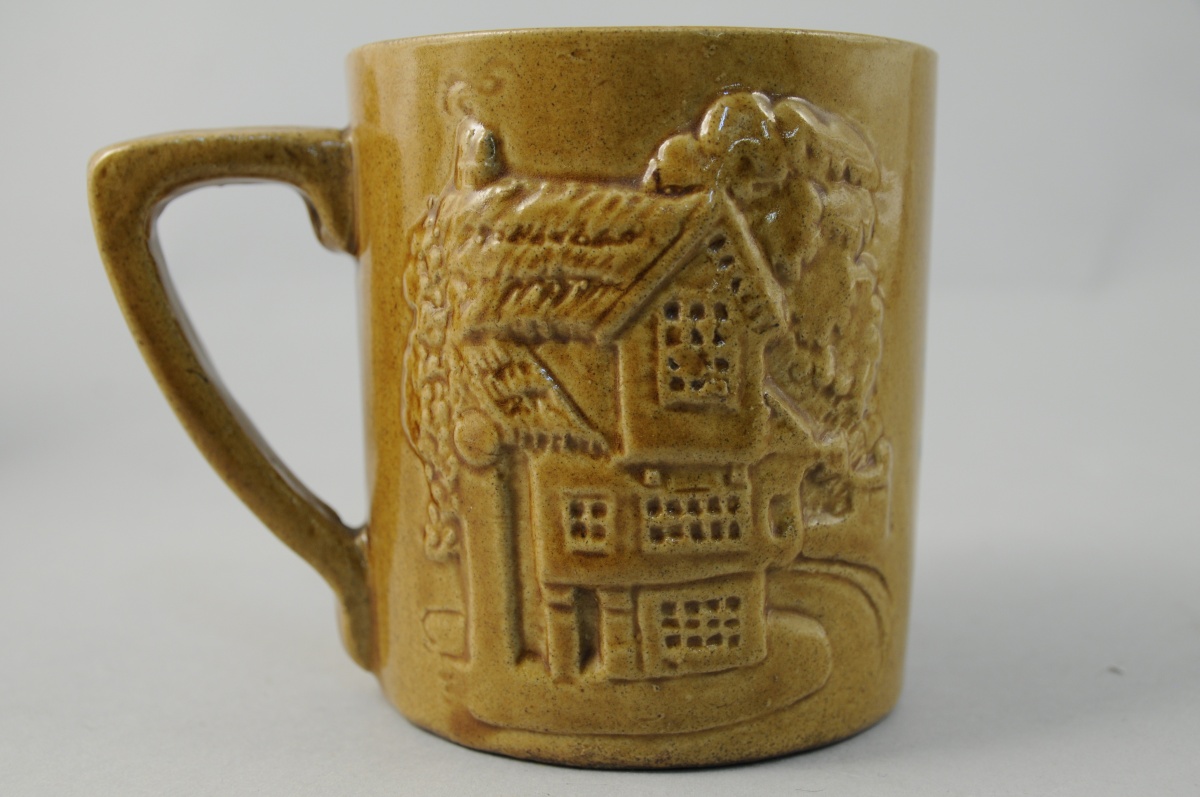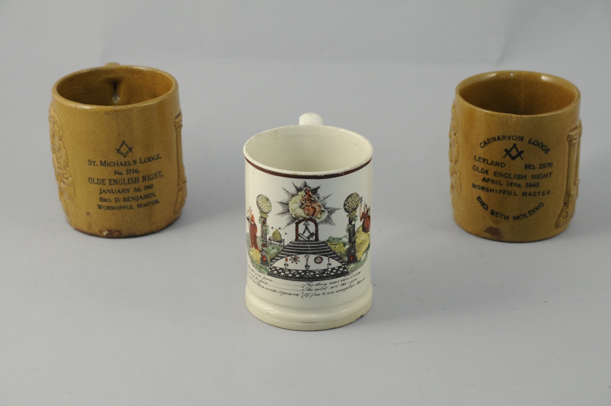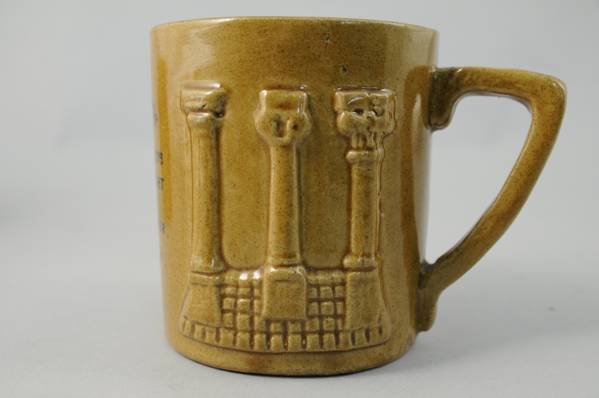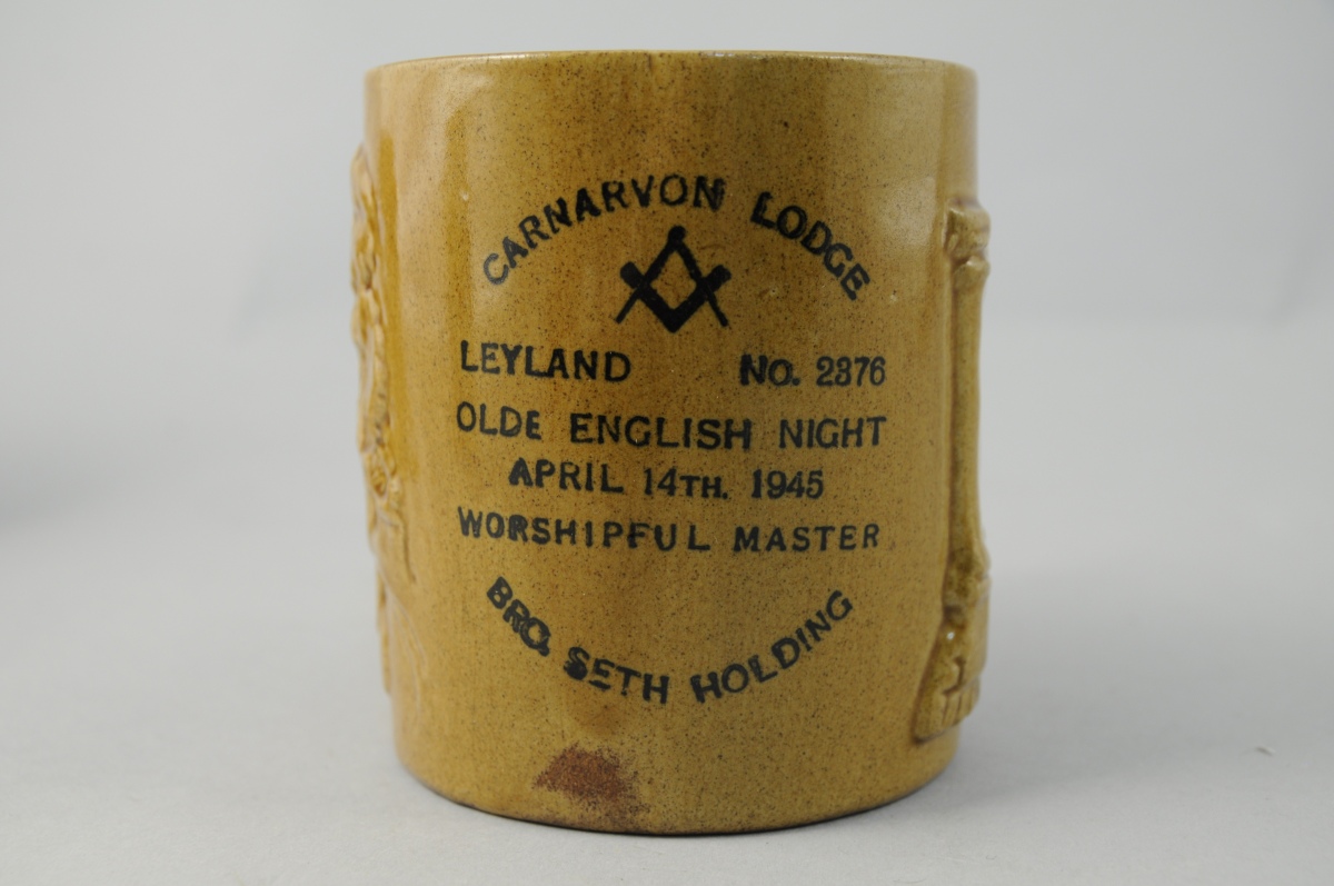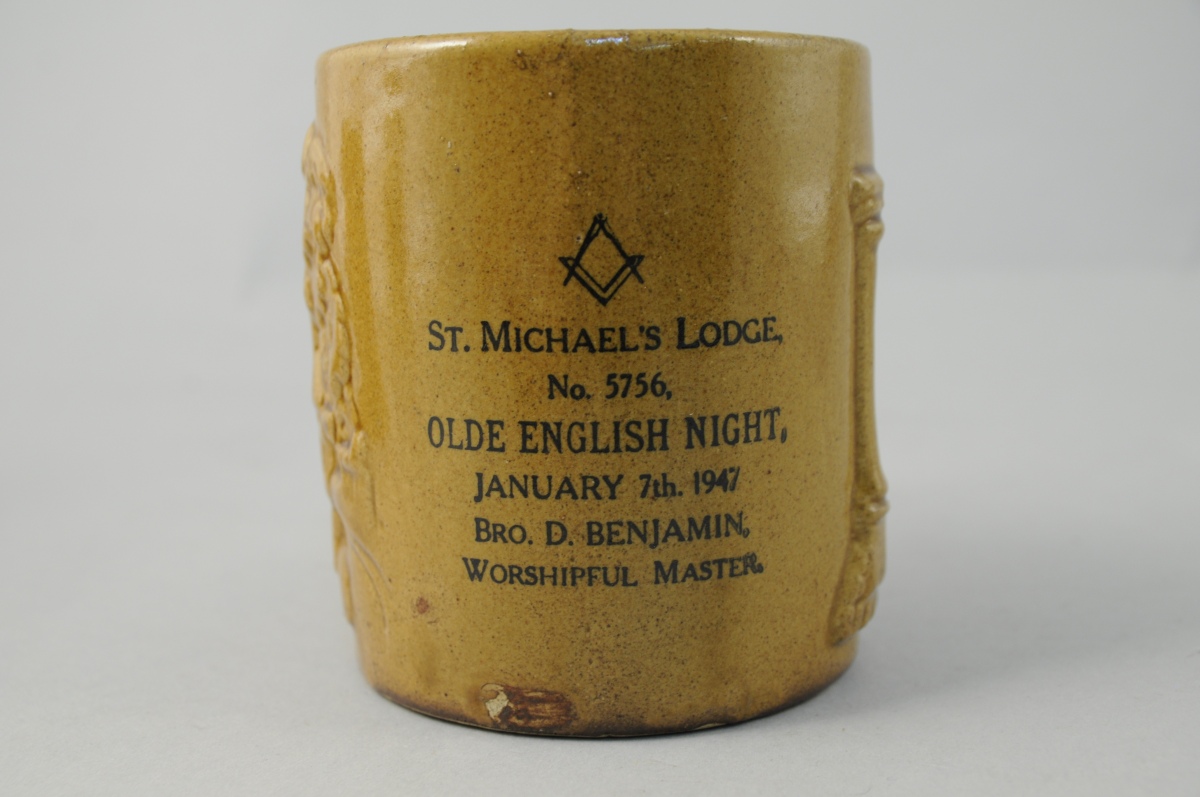 - Deux chopes en grès marron clair. Décor en relief d'une maison et de trois colonnes, une dorique, une ionique et une corinthienne. L'une marquée "Loge de Carnarvon", datée de 1945 et ayant appartenu à "Seth Holding". L'autre marquée "Loge St Michael", datée de 1947 et ayant appartenu à "D. Benjamin". XXème. Haut. 10,7, Diam. 9,6 cm.